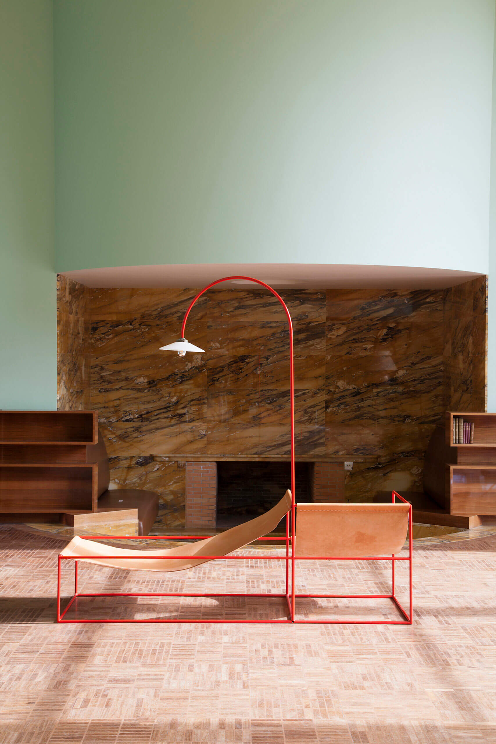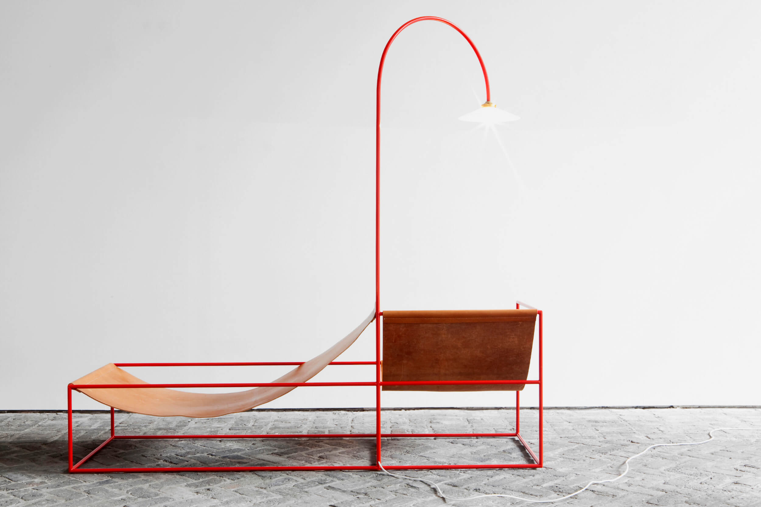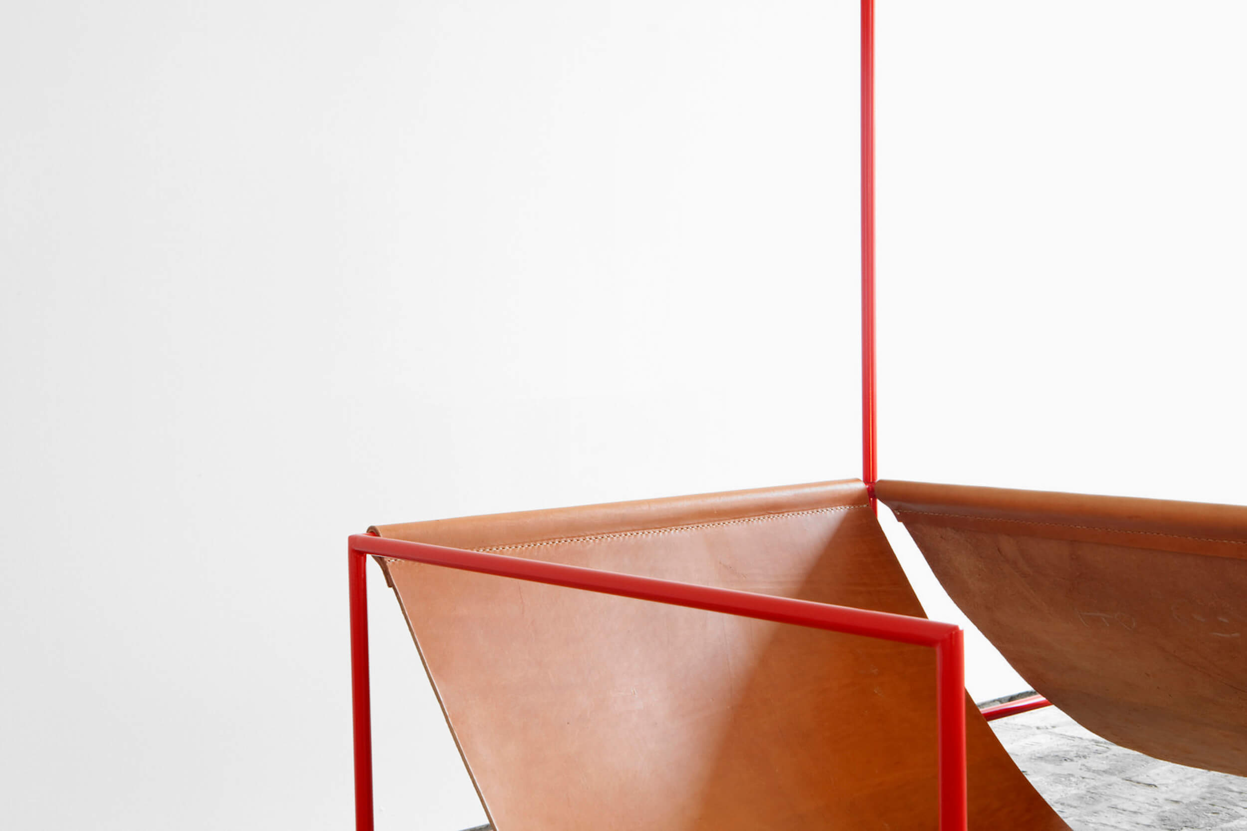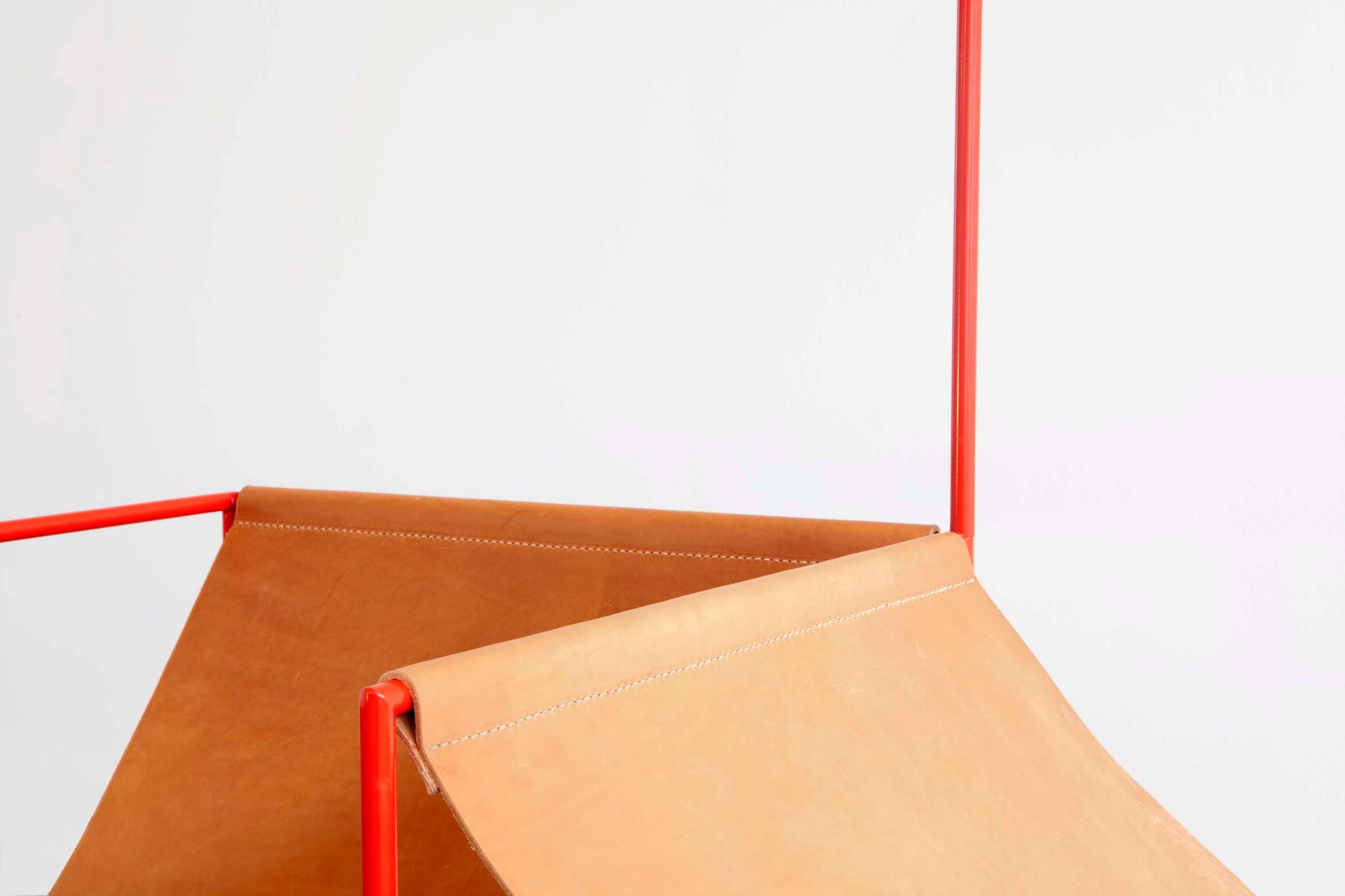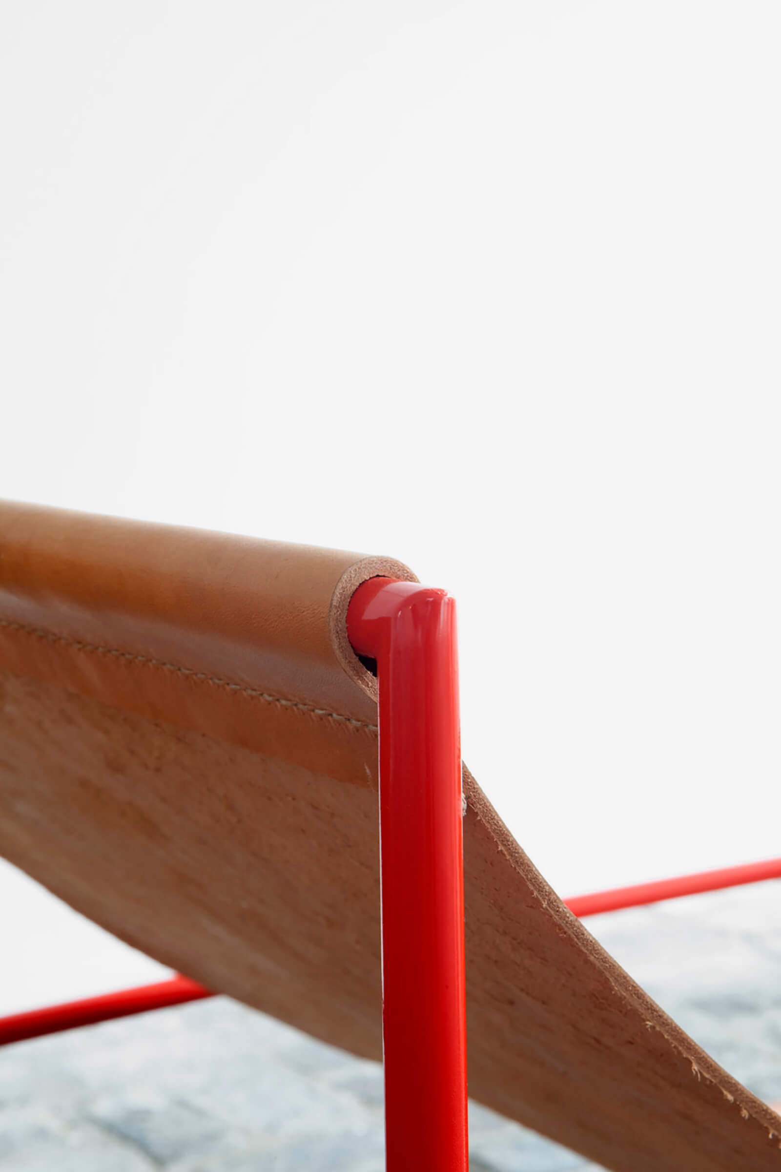 빨간 스틸의 선과 가죽의 조합이 눈길을 끄는 의자로 거실, 스튜디오 공간에 포인트를 주기 좋습니다.
