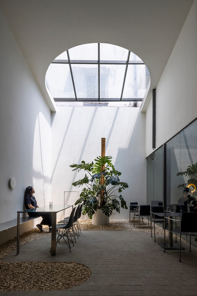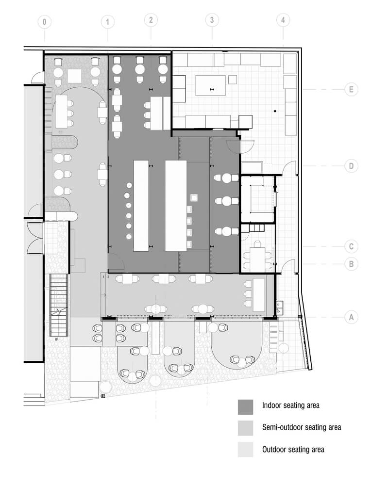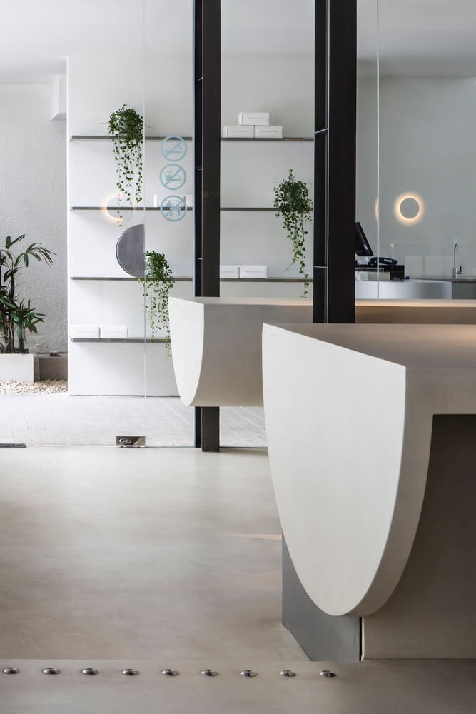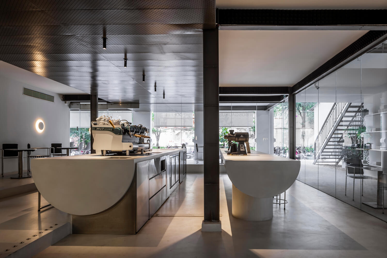 카페는 자신들의 커피 제조 과정을 대표하는 투명성이 있다고 믿으며 이런 정신은 우아하게 구현되었습니다. 프레임 없애 실내와 실외 간 시각적 연결을 실현하였으며 가구를 맞춤 제작하여 무대 스테이지 바의 무게 균형을 맞춰 가볍고 얇게 디자인하였습니다.