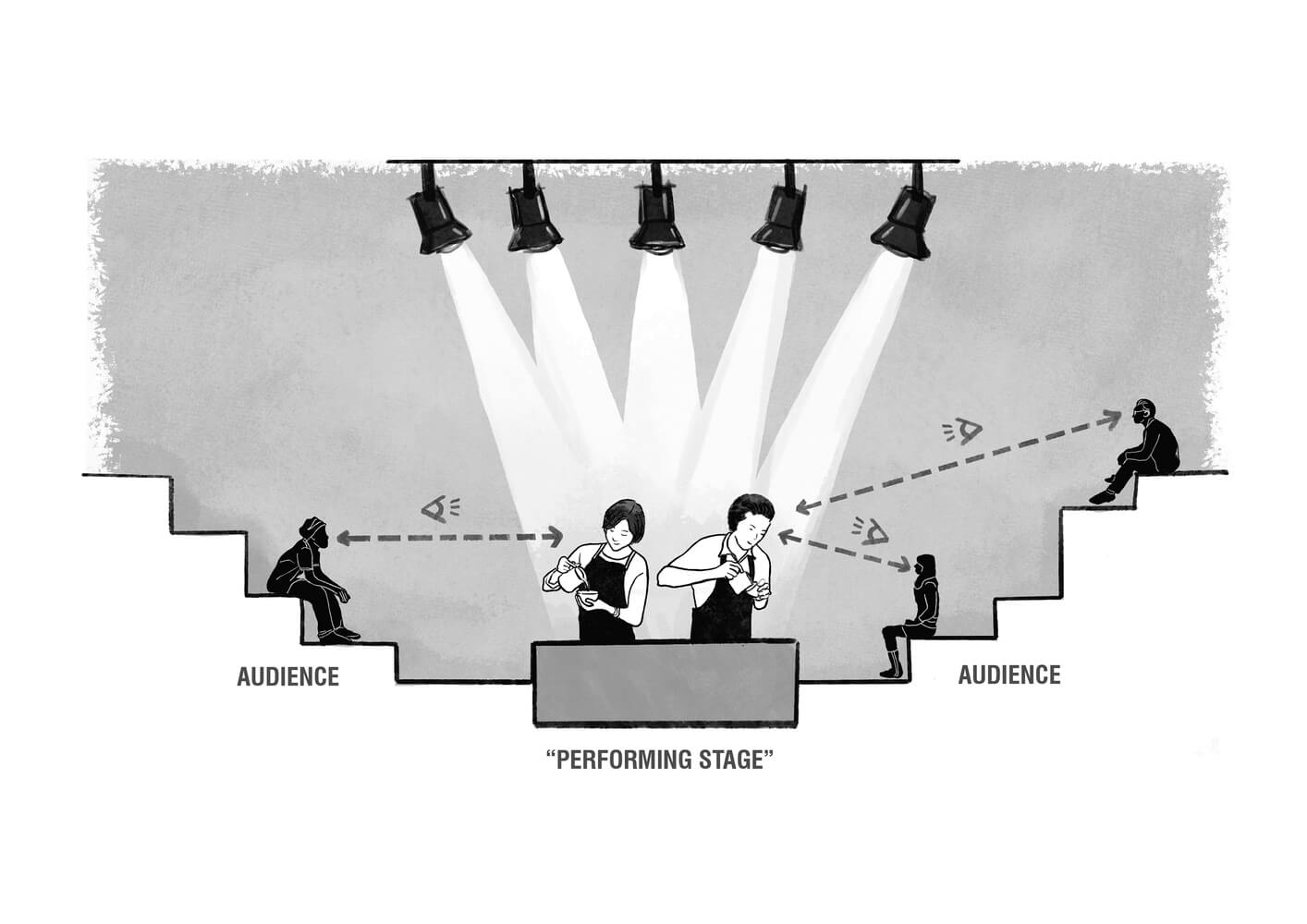 바리스타 공연자와 고객 사이의 다양한 상호작용을 원했기 때문에 다양한 눈높이 관점을 설계하였습니다.