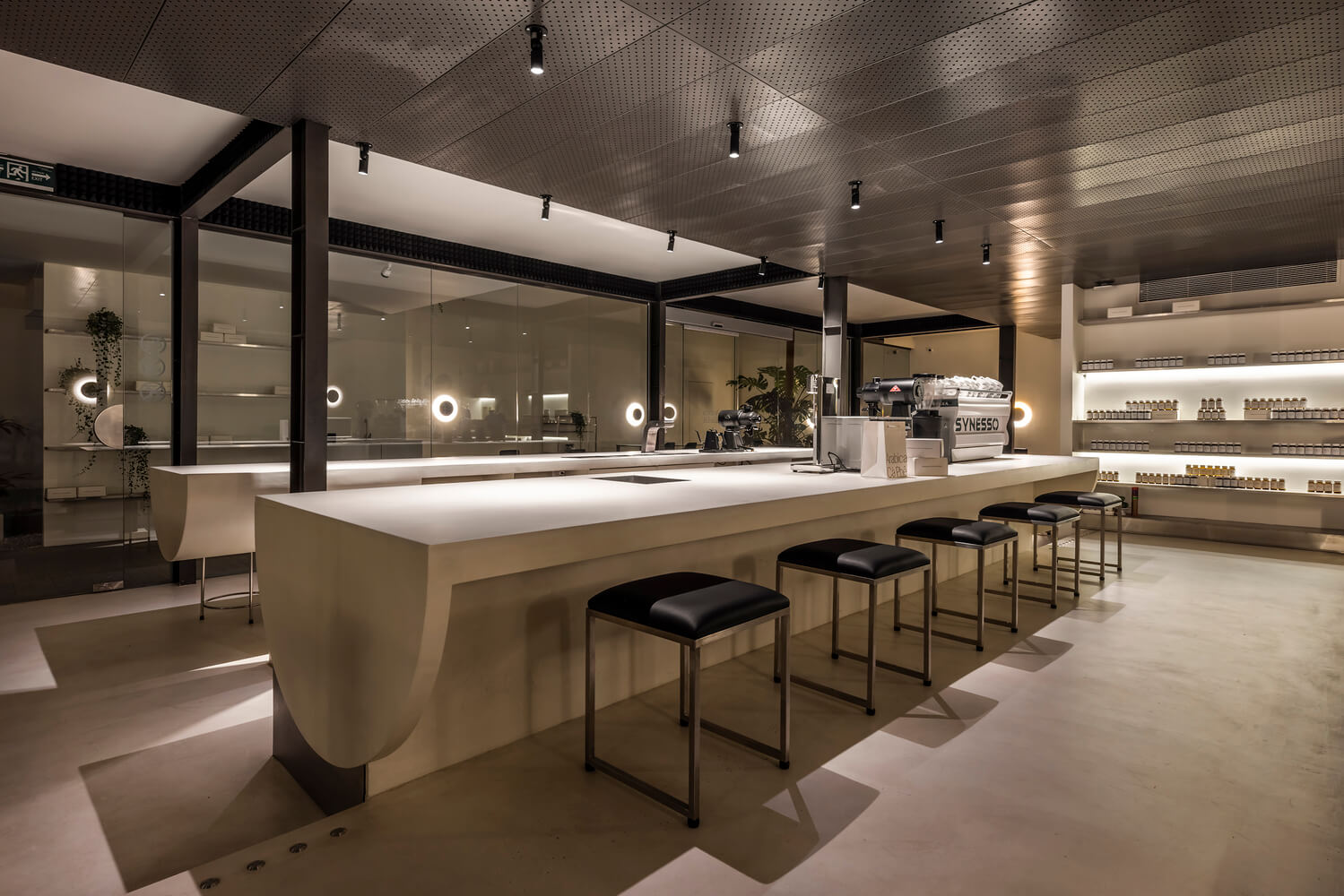 카페는 자신들의 커피 제조 과정을 대표하는 투명성이 있다고 믿으며 이런 정신은 우아하게 구현되었습니다. 프레임 없애 실내와 실외 간 시각적 연결을 실현하였으며 가구를 맞춤 제작하여 무대 스테이지 바의 무게 균형을 맞춰 가볍고 얇게 디자인하였습니다.