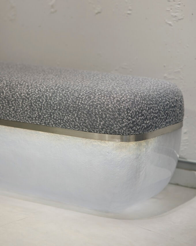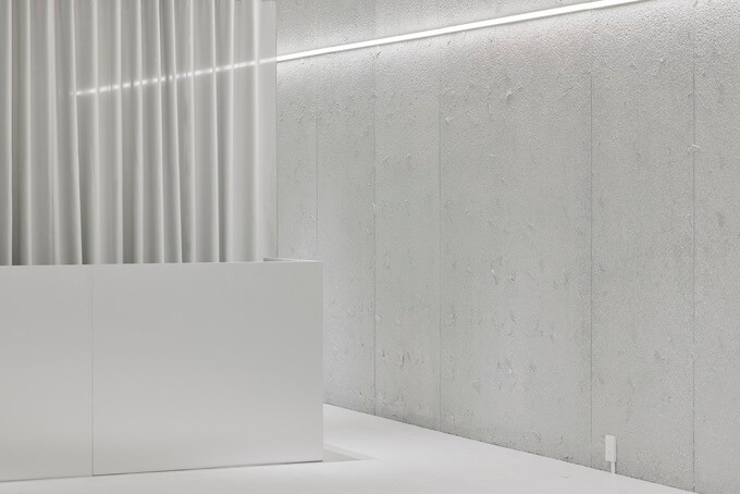 지하층은 화강암으로 만들어져 자연 채광이 들어오지 않습니다. 독특한 분위기의 바닥을 유연하게 활용할 수 있도록 입구 앞에 커튼레일을 설치해 커튼으로 공간을 분리했습니다. 모든 용도에 적합하면서도 무거운 분위기를 연출하지 않는 은색을 메인 컬러로 사용했습니다.
