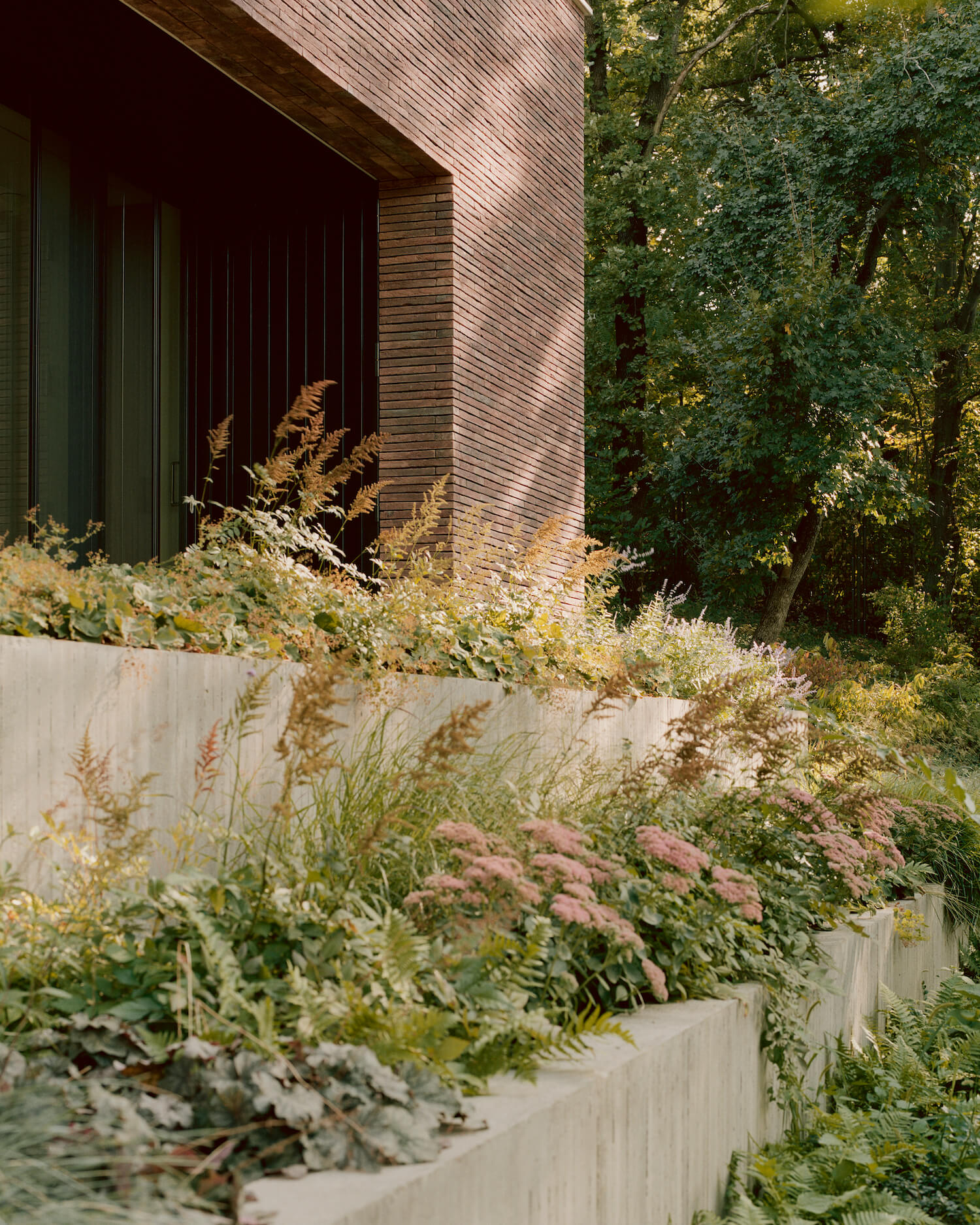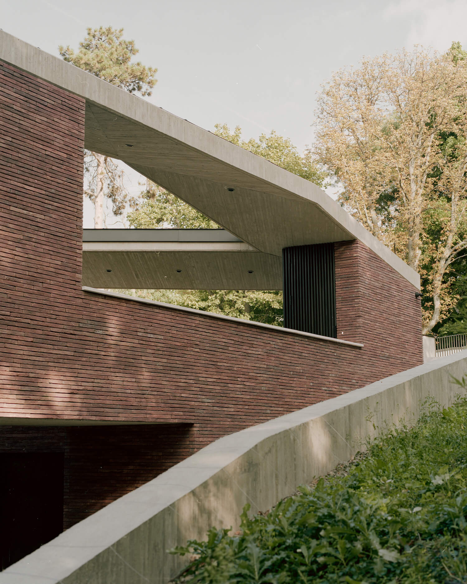 외관은 구조용 콘크리트의 견고함과 내구성을 위해 통풍이 되는 길쭉한 벽돌 피복재를 사용하였습니다. 도장 목재 패널은 지붕의 후퇴된 표면을 장식하였으며 문과 창문은 검은색 알루미늄을 선택하였습니다. 내부적으로는 노출 콘크리트 빔과 목재 지붕 구조로 공간을 규정하여 건축적 특징을 강화하는 미니멀리즘 인테리어 악센트를 가능하게 하는 등 재료적 이중성을 나타냅니다.