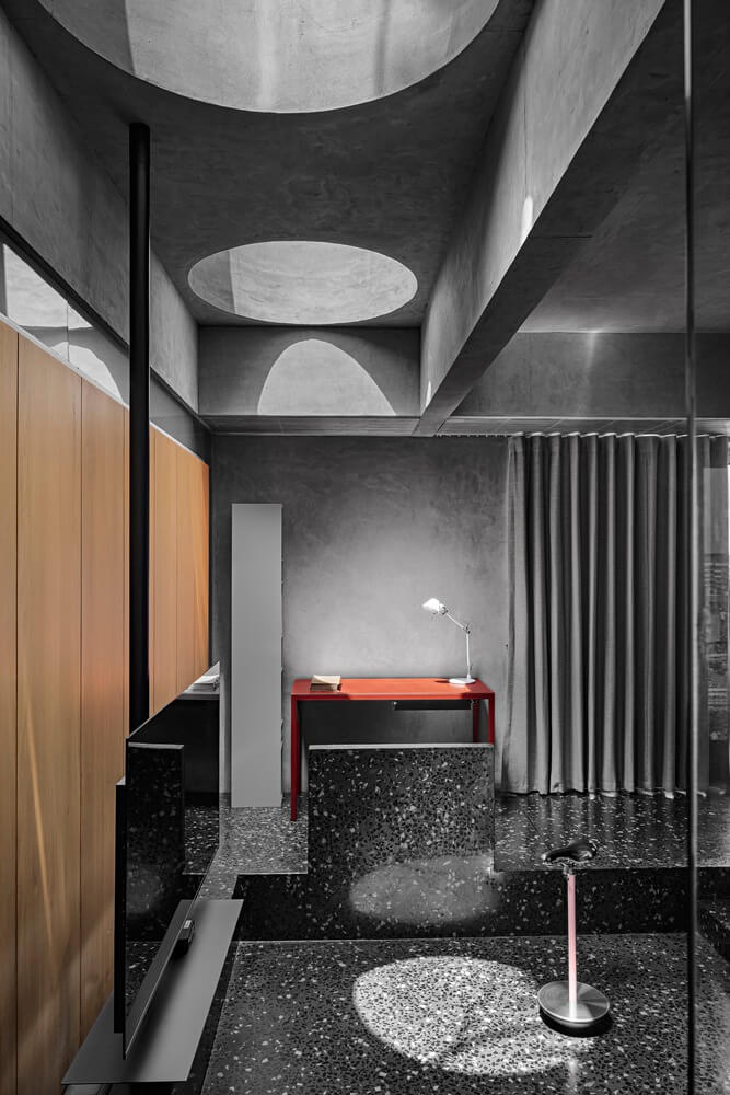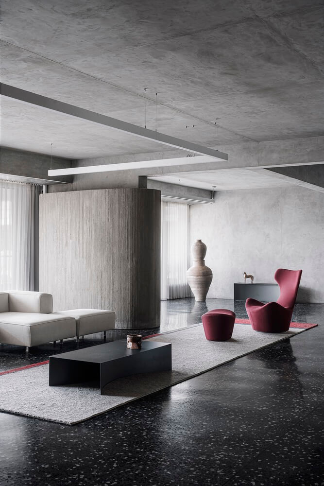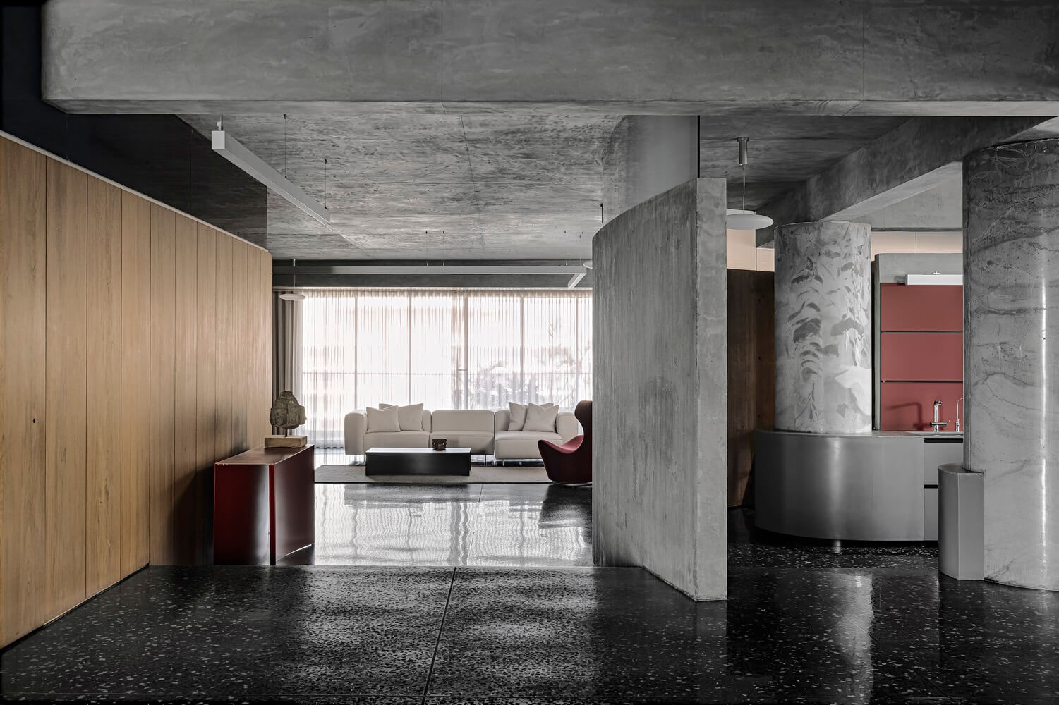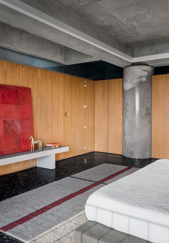 콘크리트와 목재로 드라마 같은 아파트 인테리어