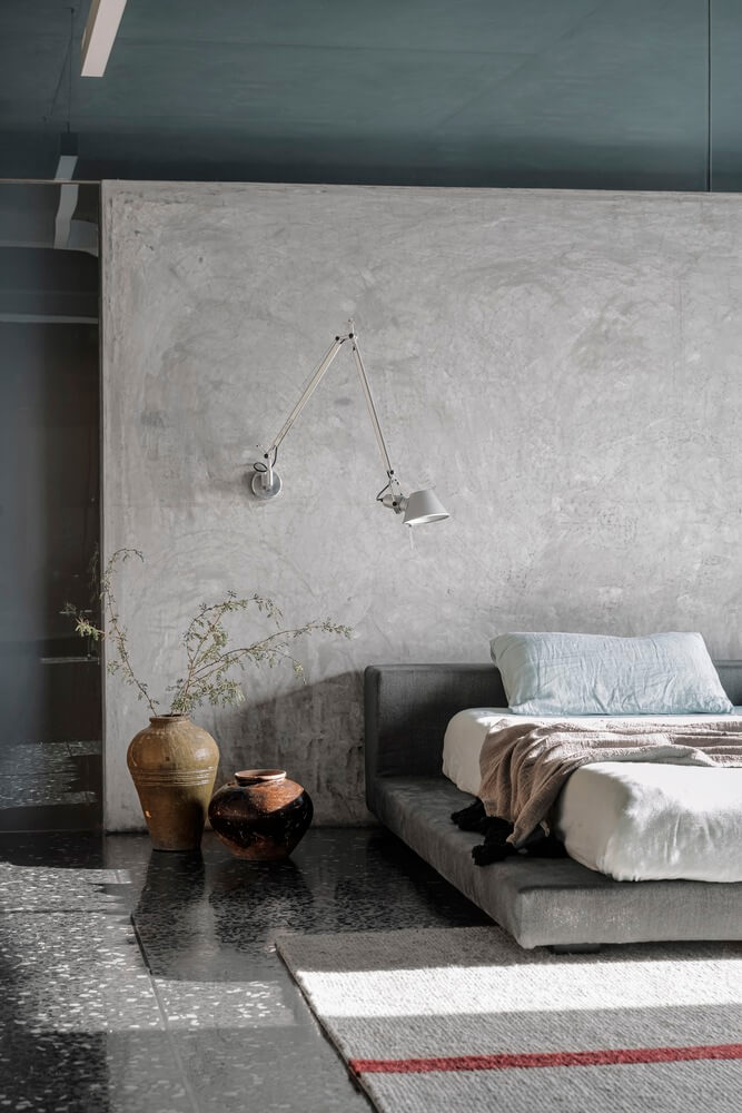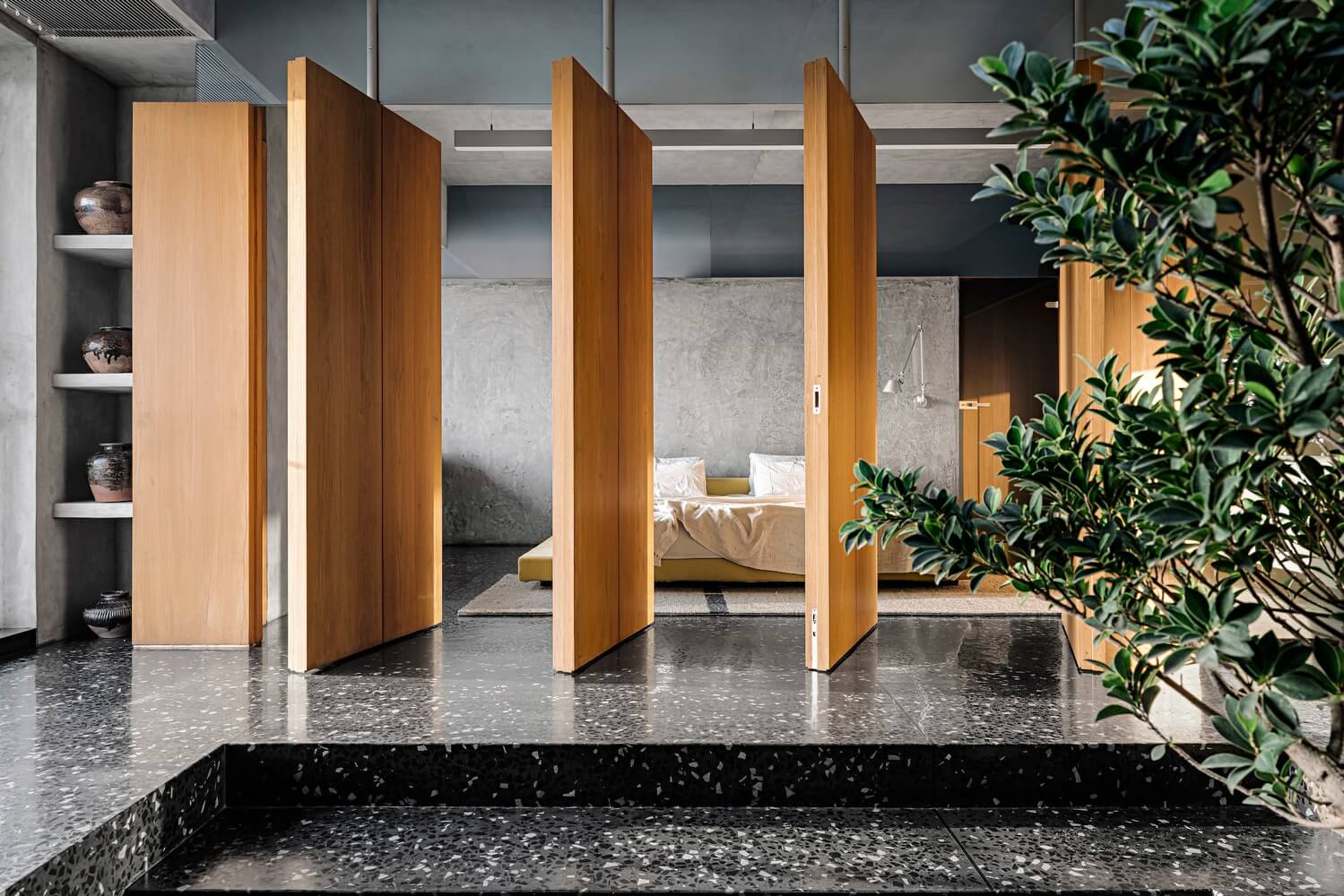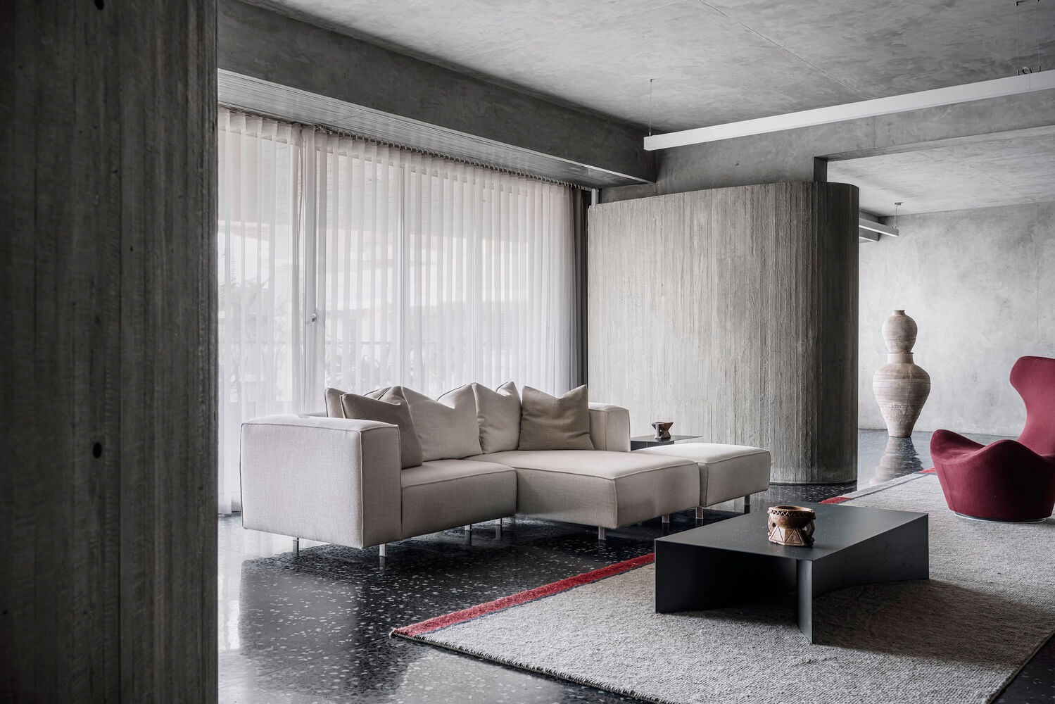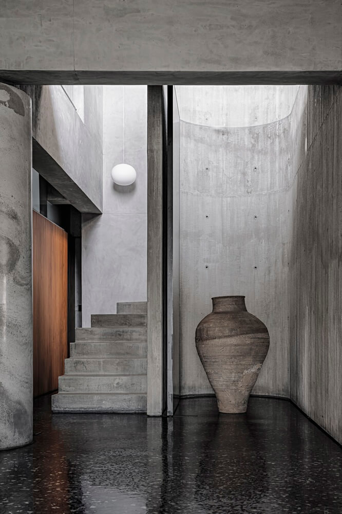 콘크리트와 목재로 드라마 같은 아파트 인테리어