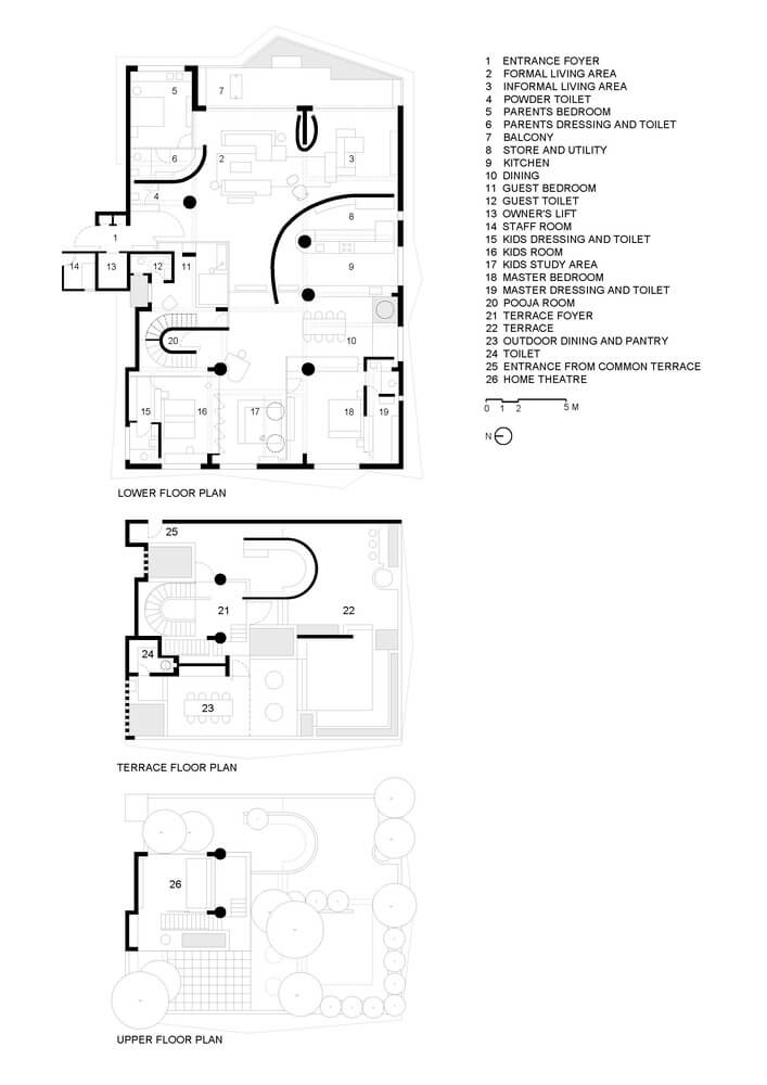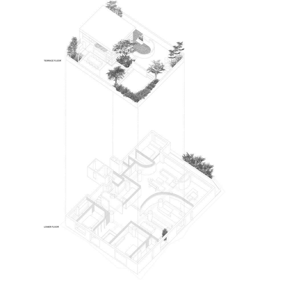아파트의 집의 짧은 쪽은 북쪽에서 남쪽으로 뻗어있으며 남쪽에는 식당 창문이 있고 북쪽에는 테라스로 연결되는 계단이 있습니다. 북쪽의 곡선 계단은 기존 아파트의 구조적 산물이며 안쪽으로는 예배 장소가 존재합니다. 서쪽 가장자리는 부부와 아들을 위한 침실이 존재합니다.