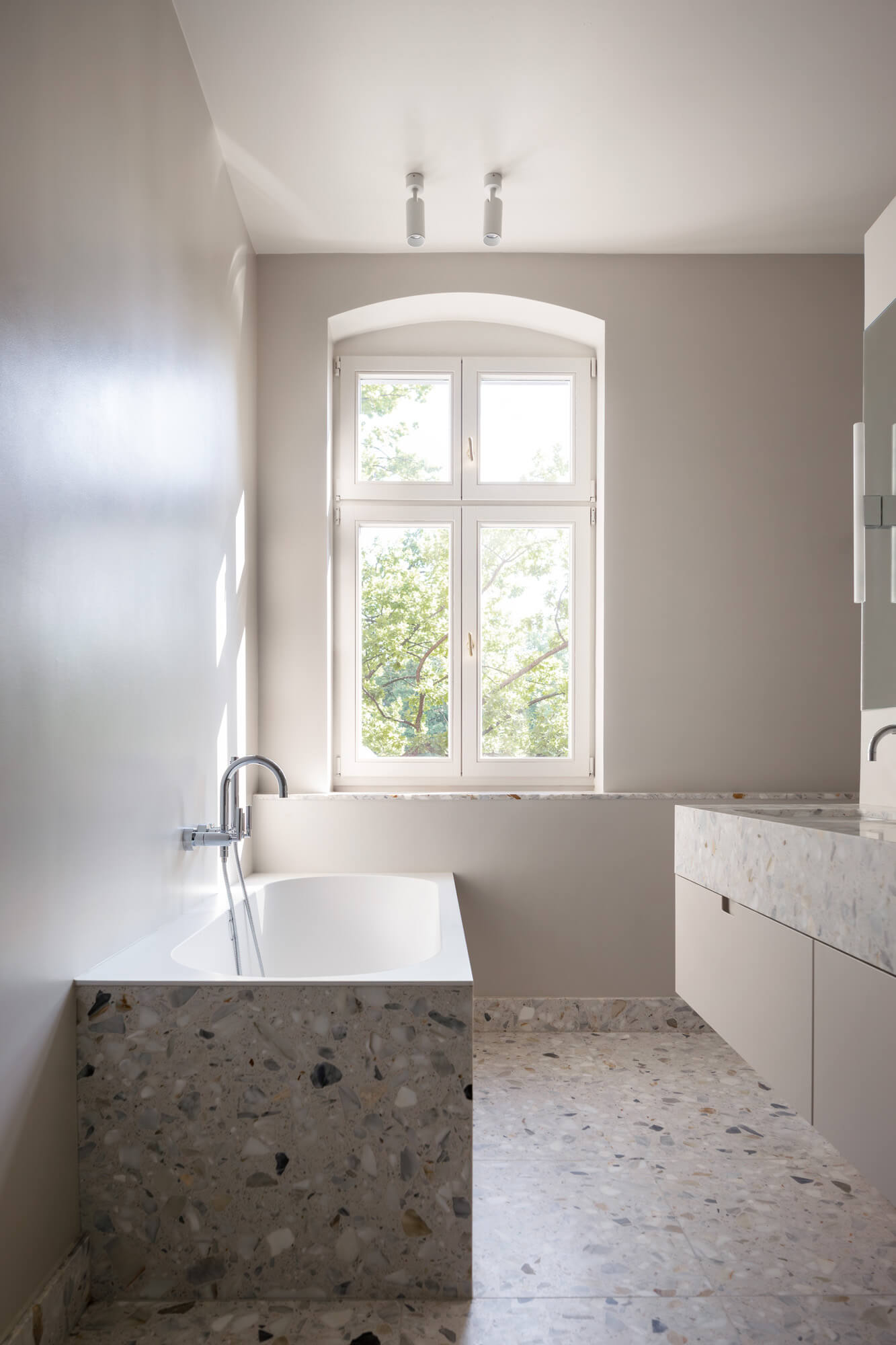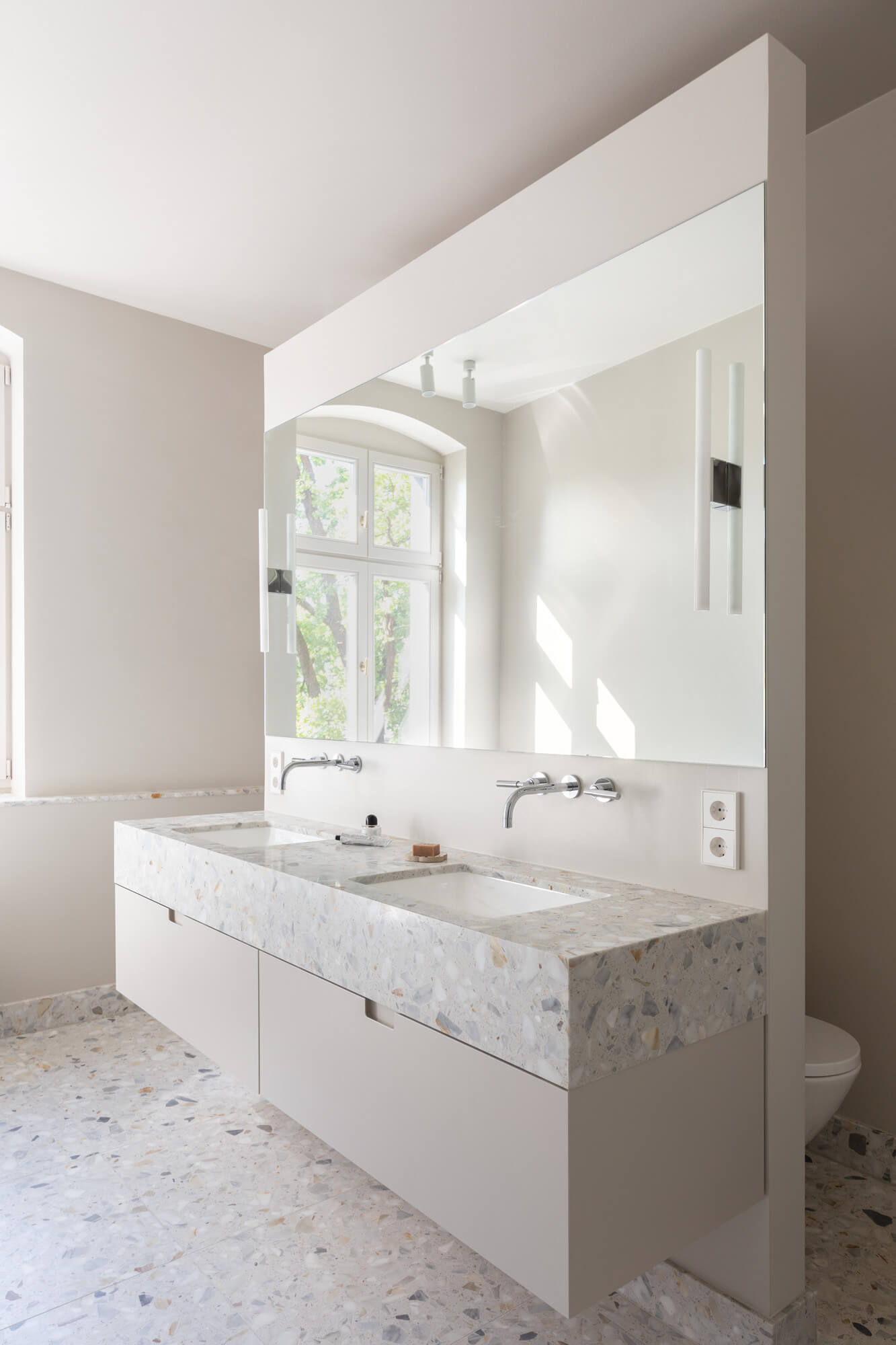 욕실의 경우 테라조 석재를 사용하여 현대적이면서 세심하게 구성되어 있습니다.