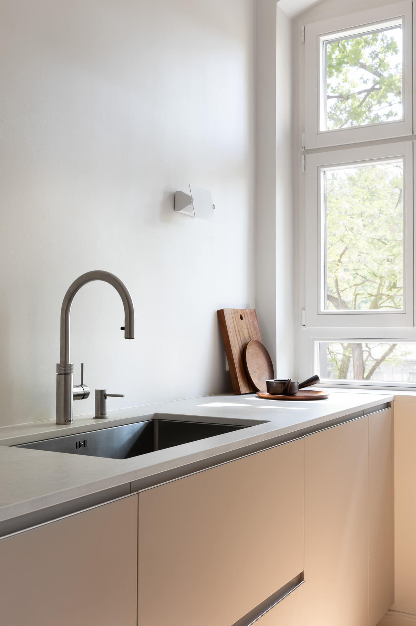 독일 베를린에 위치한 미니멀 스타일의 아파트입니다. 원목, 테라소 석재와 리넨을 사용하여 공간을 풍부하면서 따뜻한 분위기를 연출하고 있습니다. 이 집의 핵심은 부엌으로 가족과의 단란한 시간을 형성하며 요리를 하는 안식처로서 기능합니다.