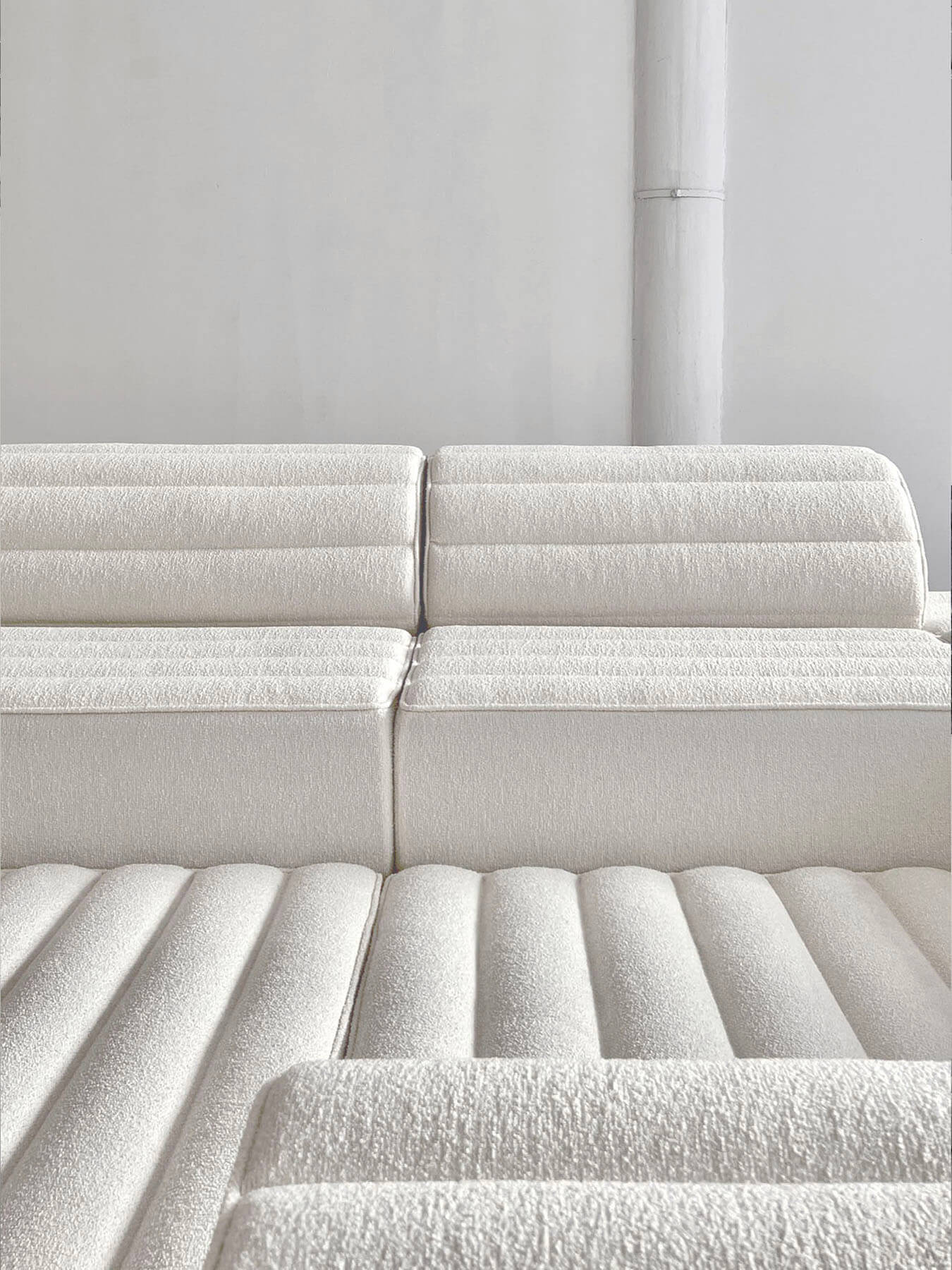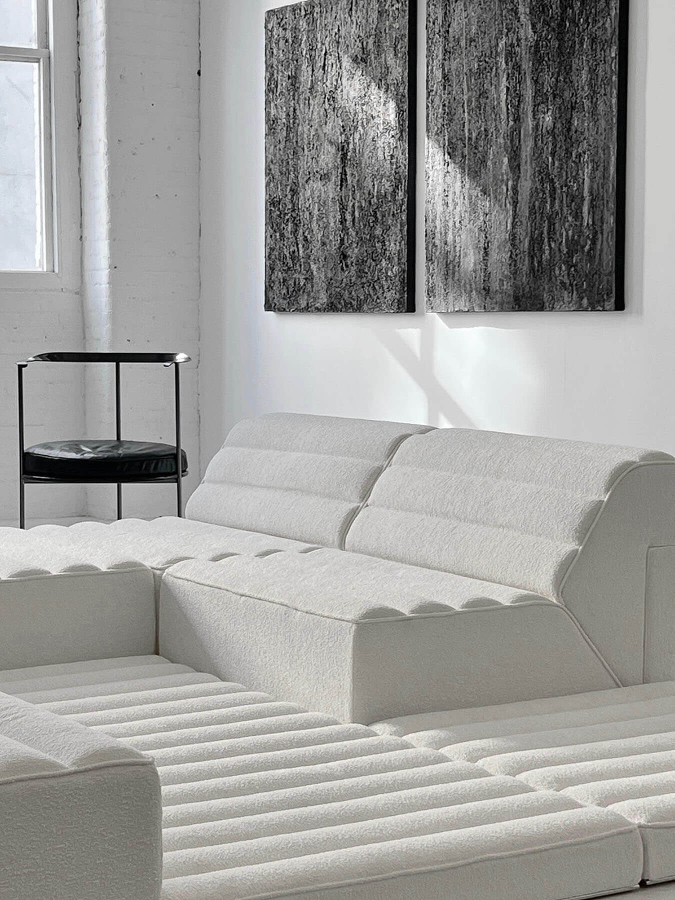 방 중앙에는 1973 Free 시스템 소파 모듈이 모여 매력적이며 몰입감 넘치는 경험을 선사합니다.