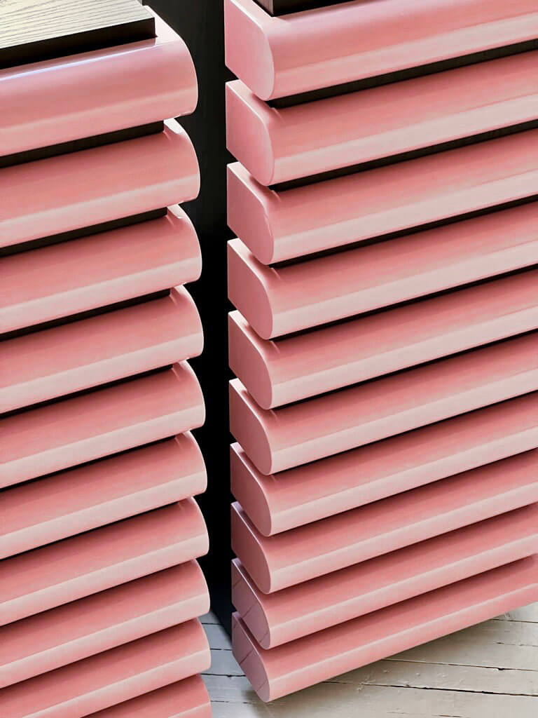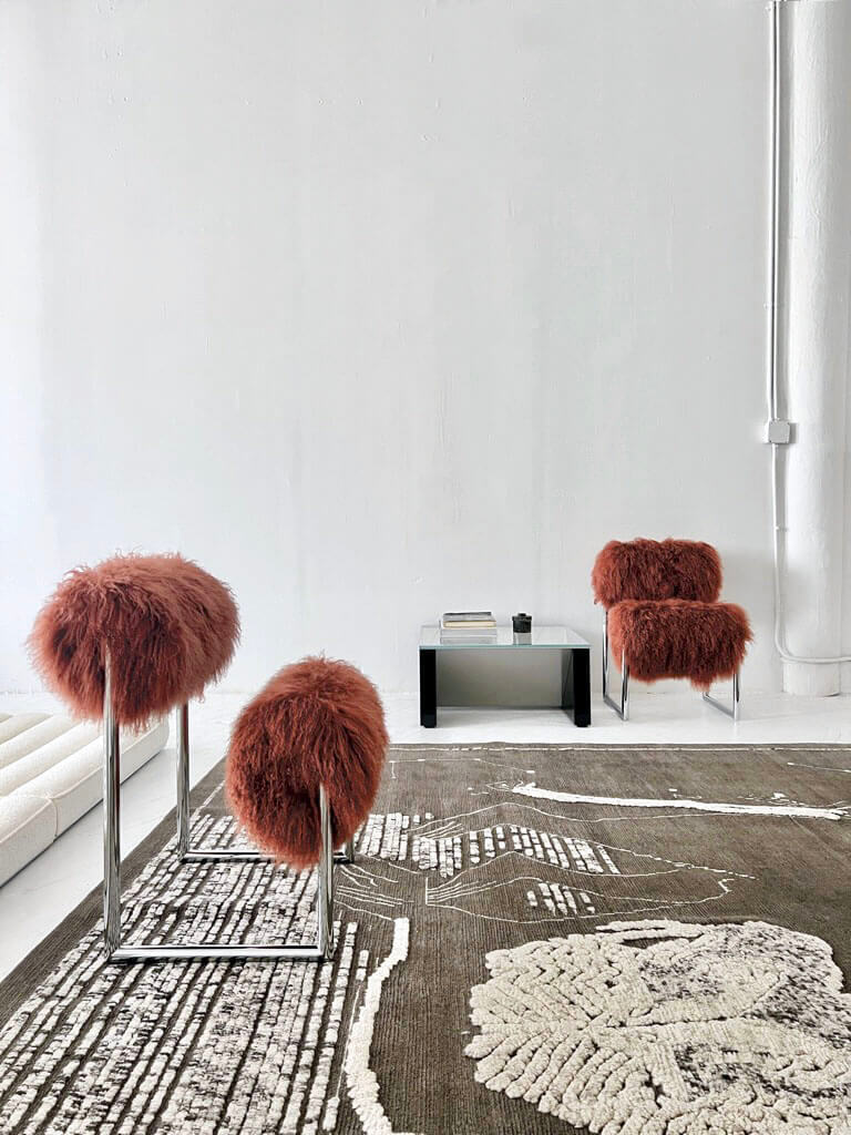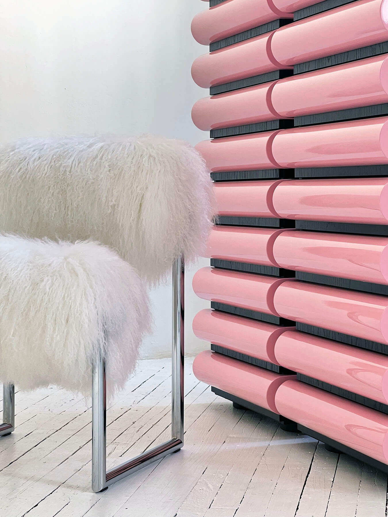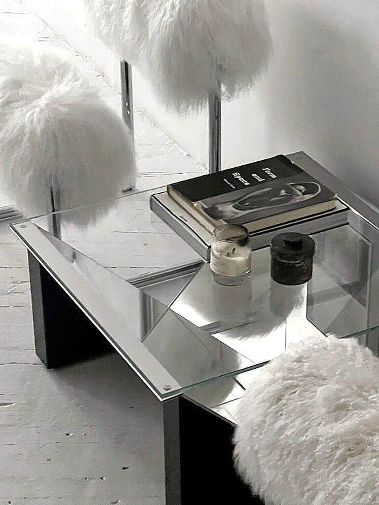 소파 옆에는 Nanda Vigo의 흰색과 녹슨 Due piu 안락의자의 폭신한 원통형 몽골 모피 쿠션이 위치합니다. 핑크색의 서랍장은 대담한 색상을 선보이는 것이 특징입니다. 주로 부드러운 곡선 형태와 대조를 이루기 위해 커피 테이블은 유리, 거울, 래커 형태의 삼각형 기하학을 도입했습니다.