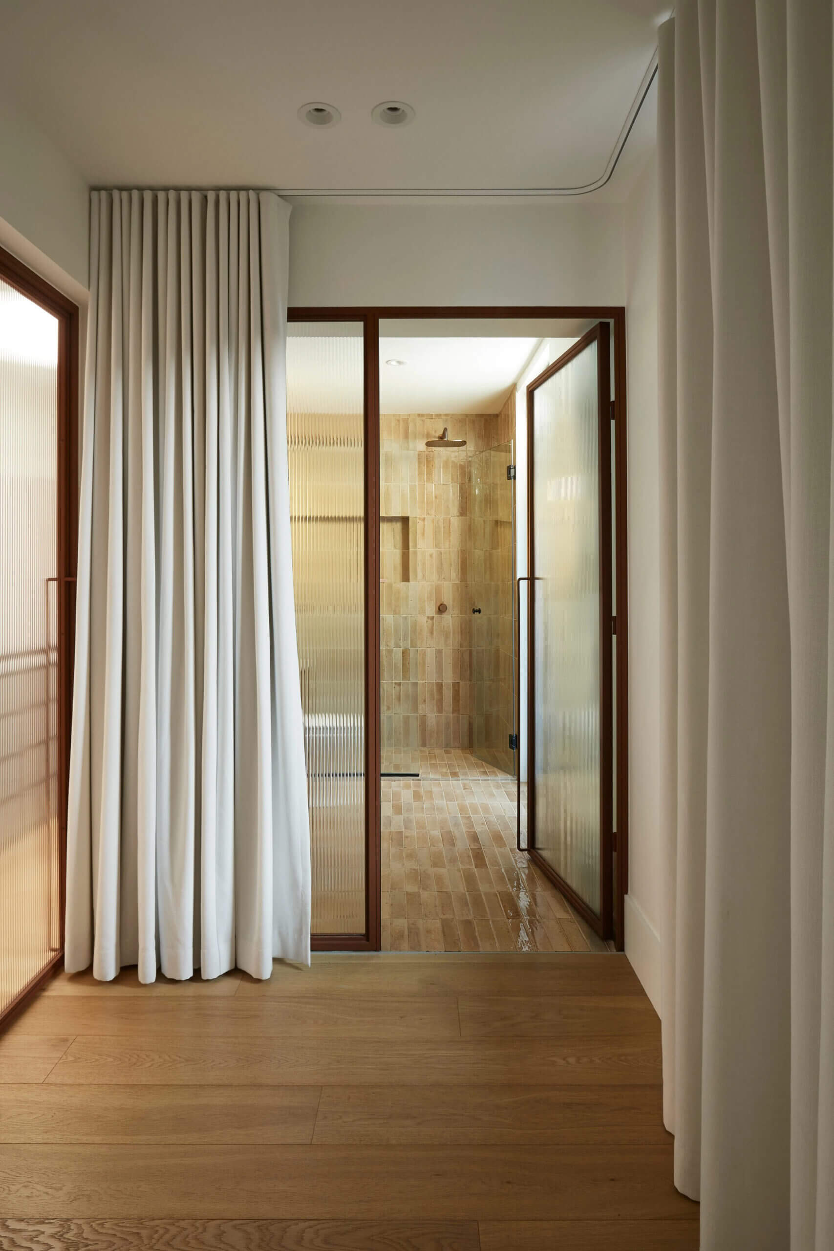 짙은 원목과 유리가 실내를 우아한 분위기를 연출하며 인접한 욕실에는 베이지색 타일, 짙은 목재, 철제 요소가 조화를 이뤄 단정되며 고풍스러운 이미지를 제공합니다.