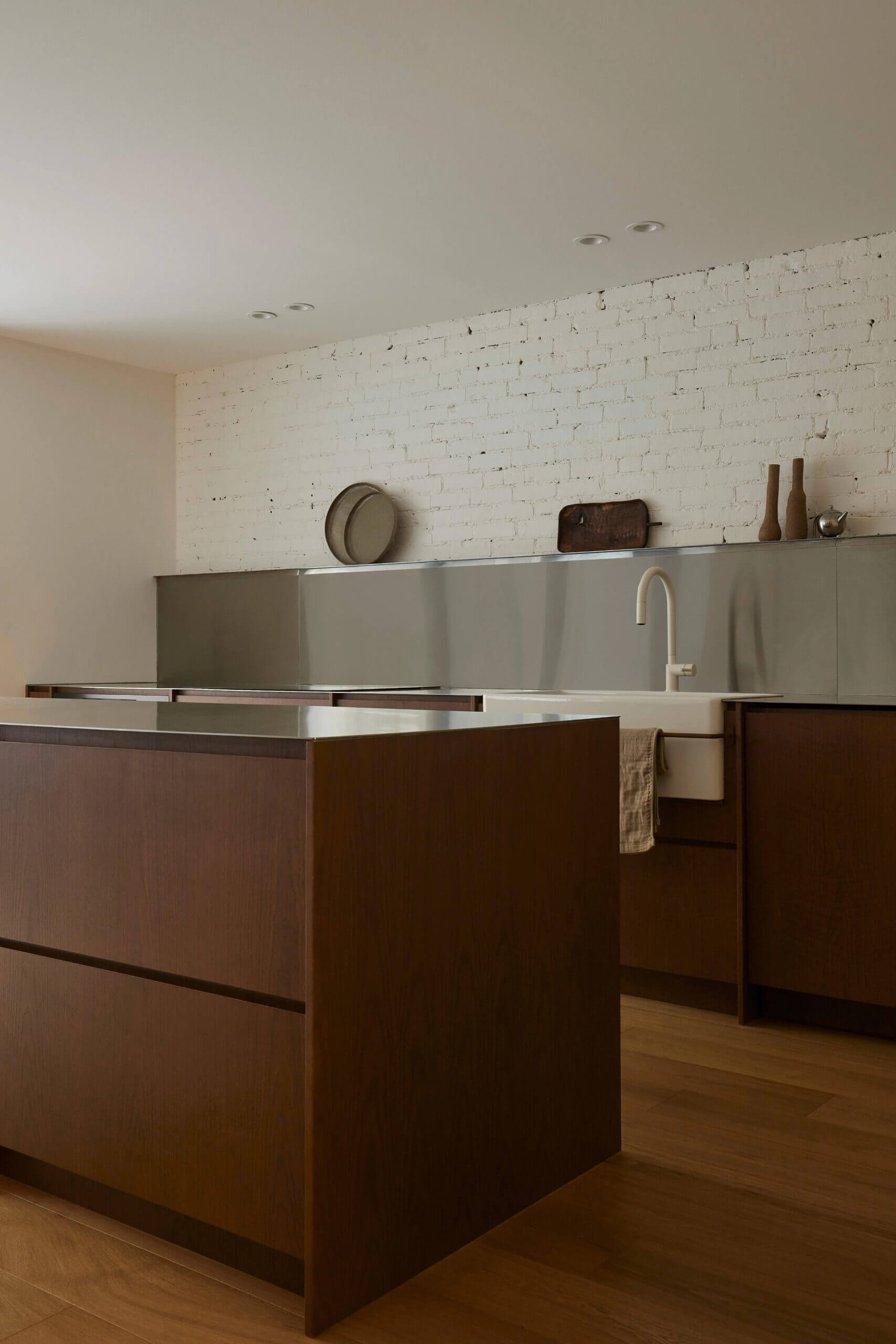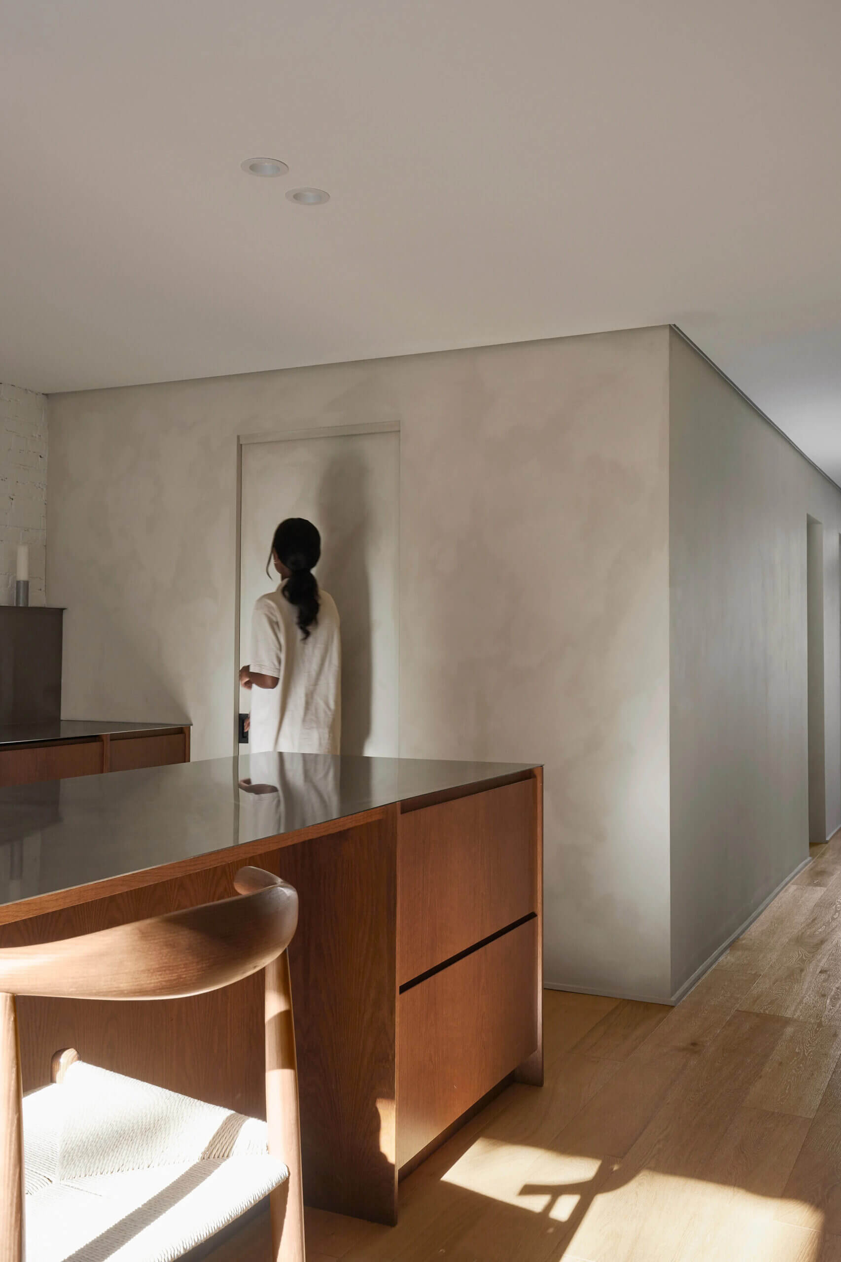 대신 2층 유닛을 디자인 접근 방식에 통합하여 건물의 무결성을 유지하면서 효율적인 공간 활용을 보장했습니다. 1층 레이아웃에서는 원래 구조가 유지되지만 공간은 2개의 공간으로 나누어집니다. 하나는 수납장, 파우더룸, 보조 주방이 위치하며 다른 하나는 거실입니다.