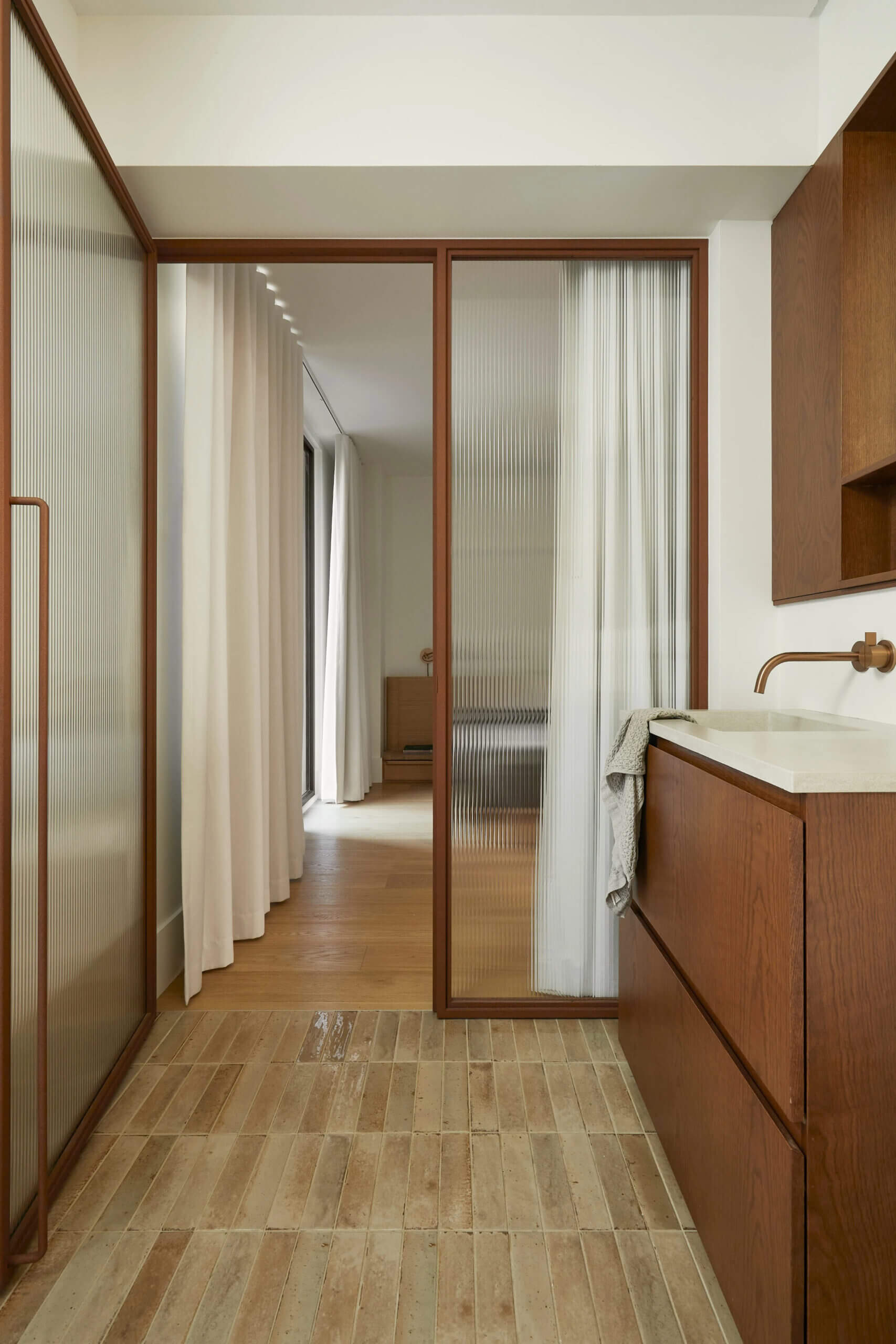 짙은 원목과 유리가 실내를 우아한 분위기를 연출하며 인접한 욕실에는 베이지색 타일, 짙은 목재, 철제 요소가 조화를 이뤄 단정되며 고풍스러운 이미지를 제공합니다.