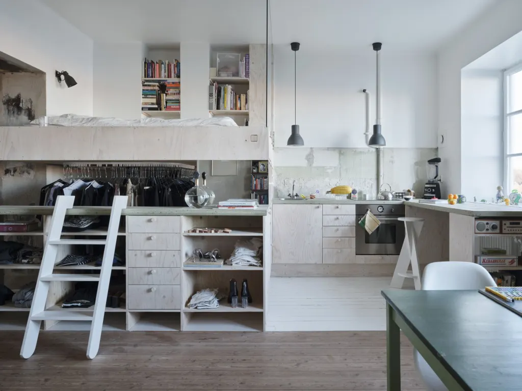 만약, 공간 내 성격들이 상이한 구조의 복층 원룸에 거주하신 분들이 계시다면 이 예시처럼 복층 아래 공간을 수납공간으로 활용해 보시기를 추천드립니다.