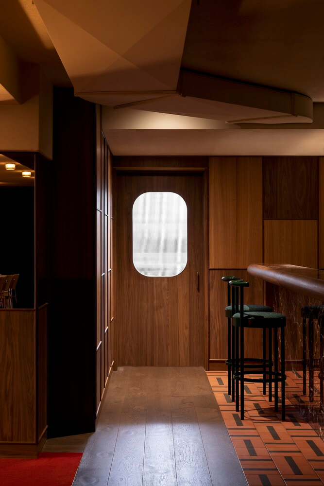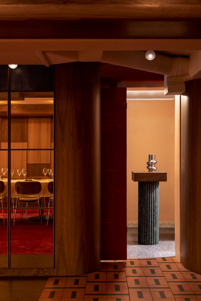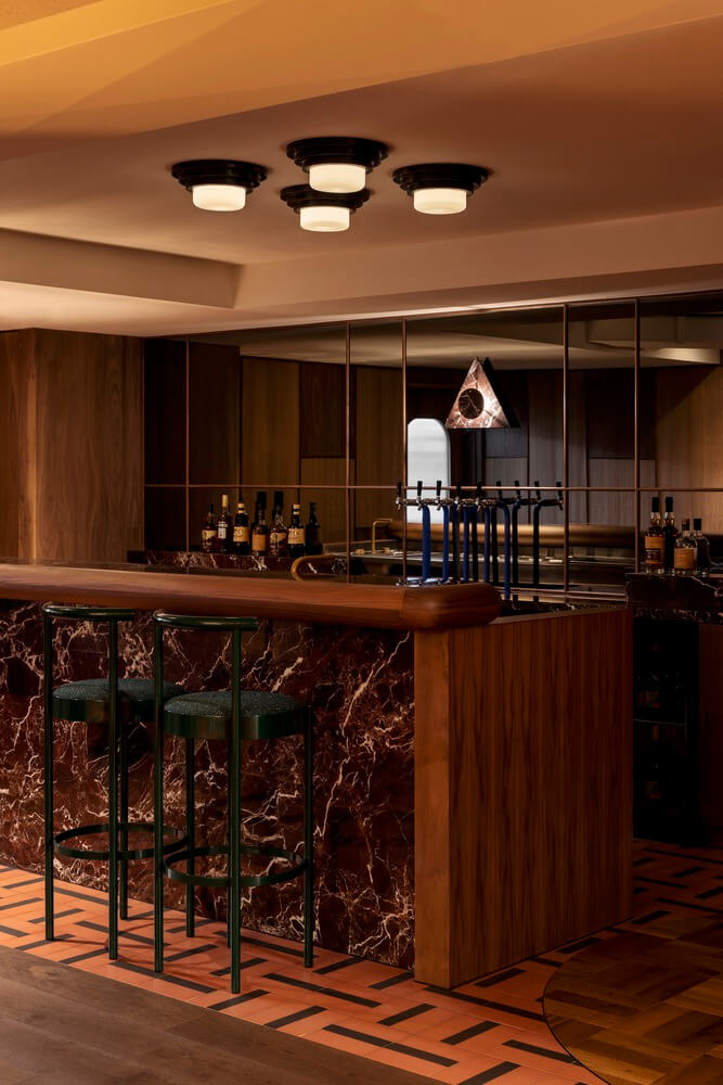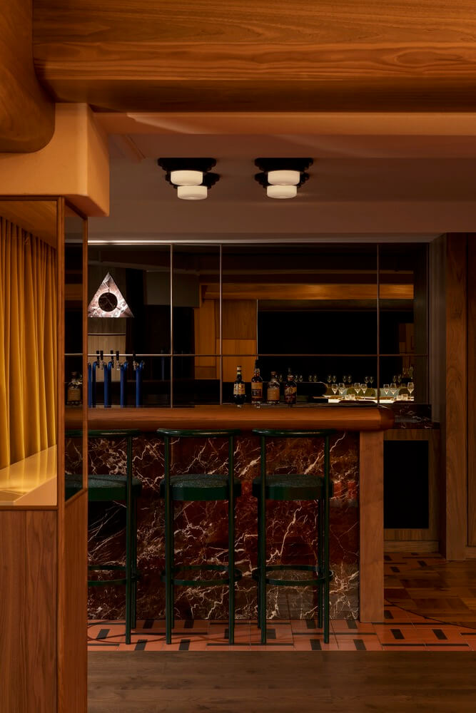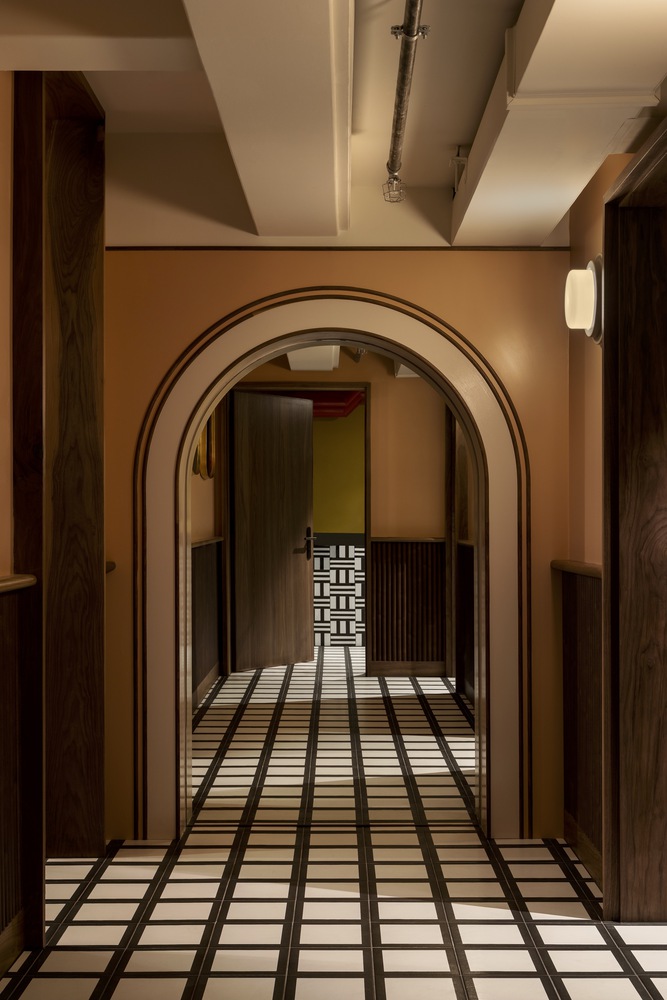 반사되는 표면과 매끄러운 원목 패널, 대리석, 기하학적인 타일 패턴 등은 지나간 시대의 산물입니다. 이런 요소들이 모여 퇴폐적이고 관대한 향수를 불러일으켜 손님들에게 과거로의 여행을 떠나는 느낌을 선사합니다.