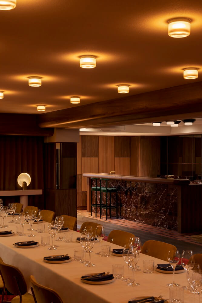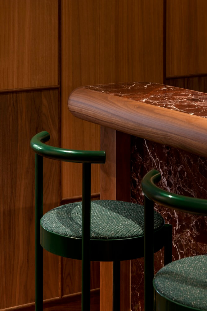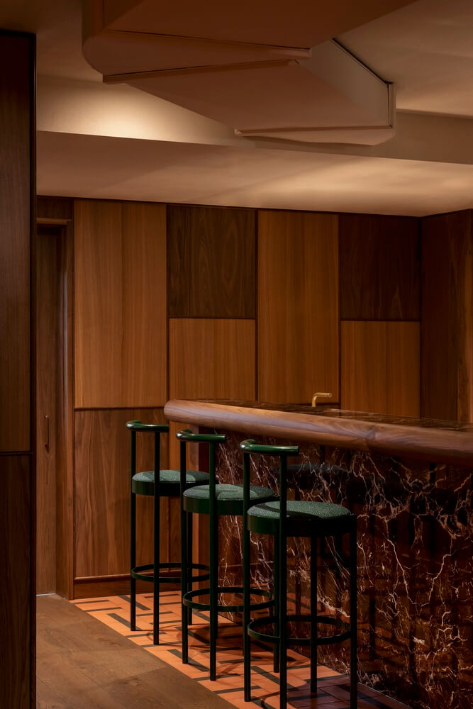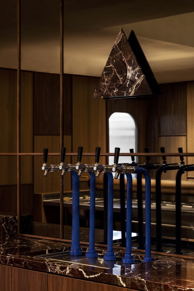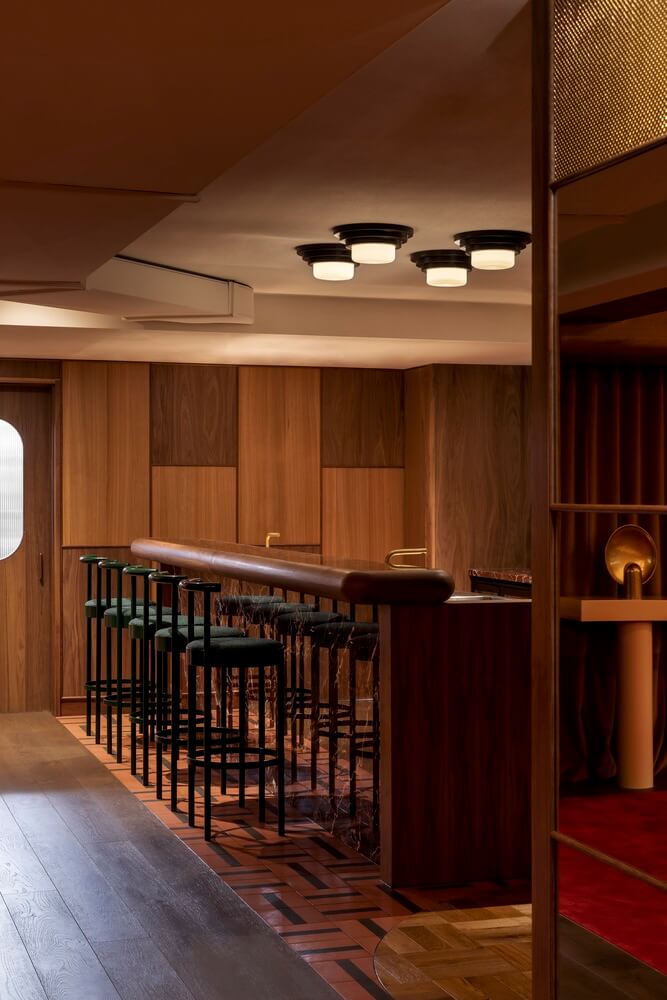 반사되는 표면과 매끄러운 원목 패널, 대리석, 기하학적인 타일 패턴 등은 지나간 시대의 산물입니다. 이런 요소들이 모여 퇴폐적이고 관대한 향수를 불러일으켜 손님들에게 과거로의 여행을 떠나는 느낌을 선사합니다.