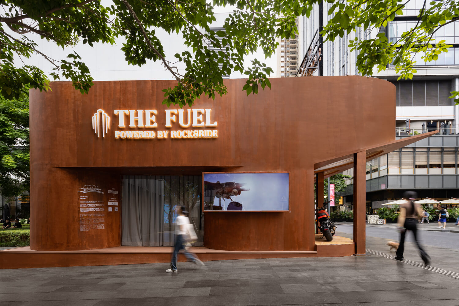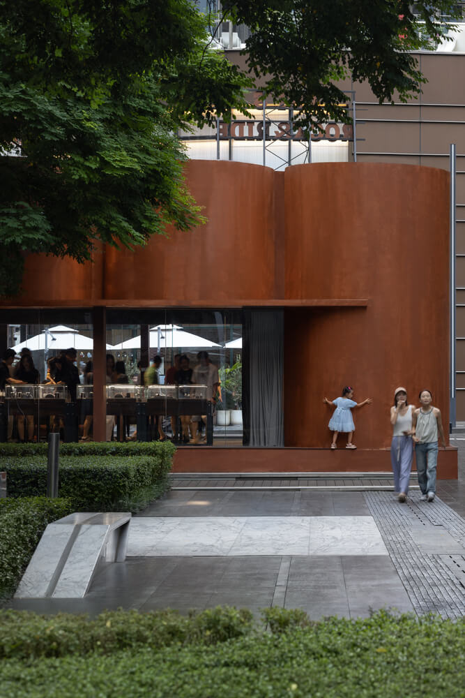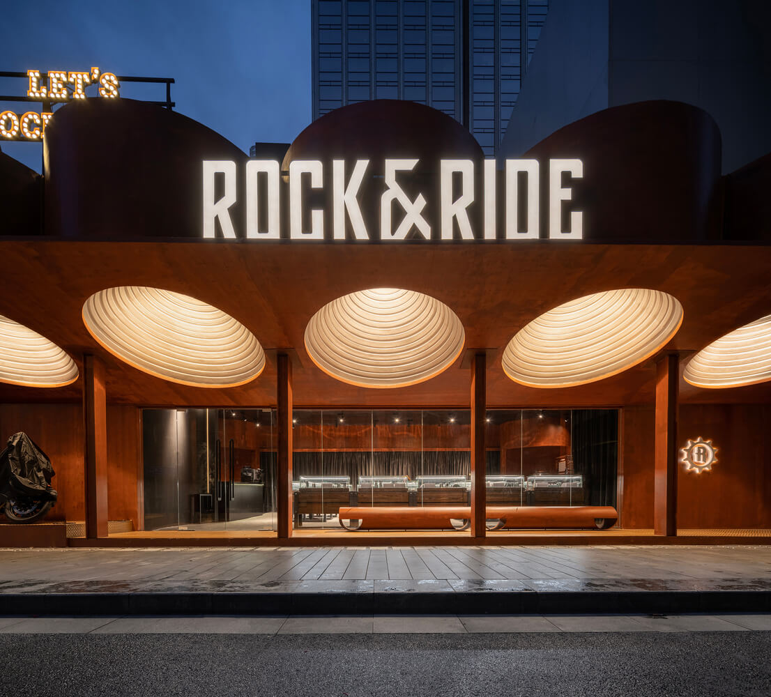 The entire building is covered in weathered steel finish paint, maximizing the weight and recognition of the pop-up shop, transforming the "light" brand behavior into a "weighty" architectural statement. The building is completely open along the street, showcasing the indoor commercial ambiance to the public through glass curtain walls. American highway signs are placed on the top, surpassing the building's height limits to convey the brand message throughout the entire street.