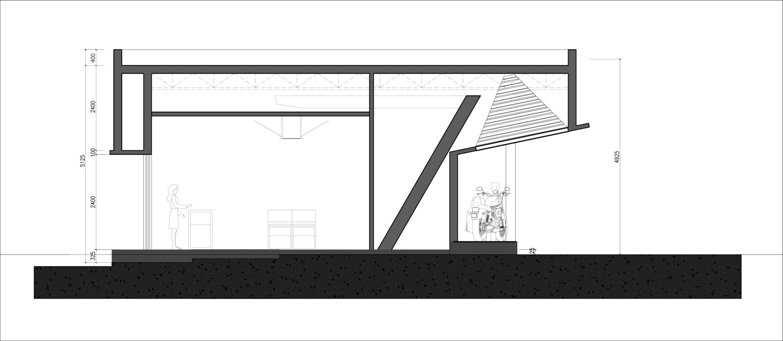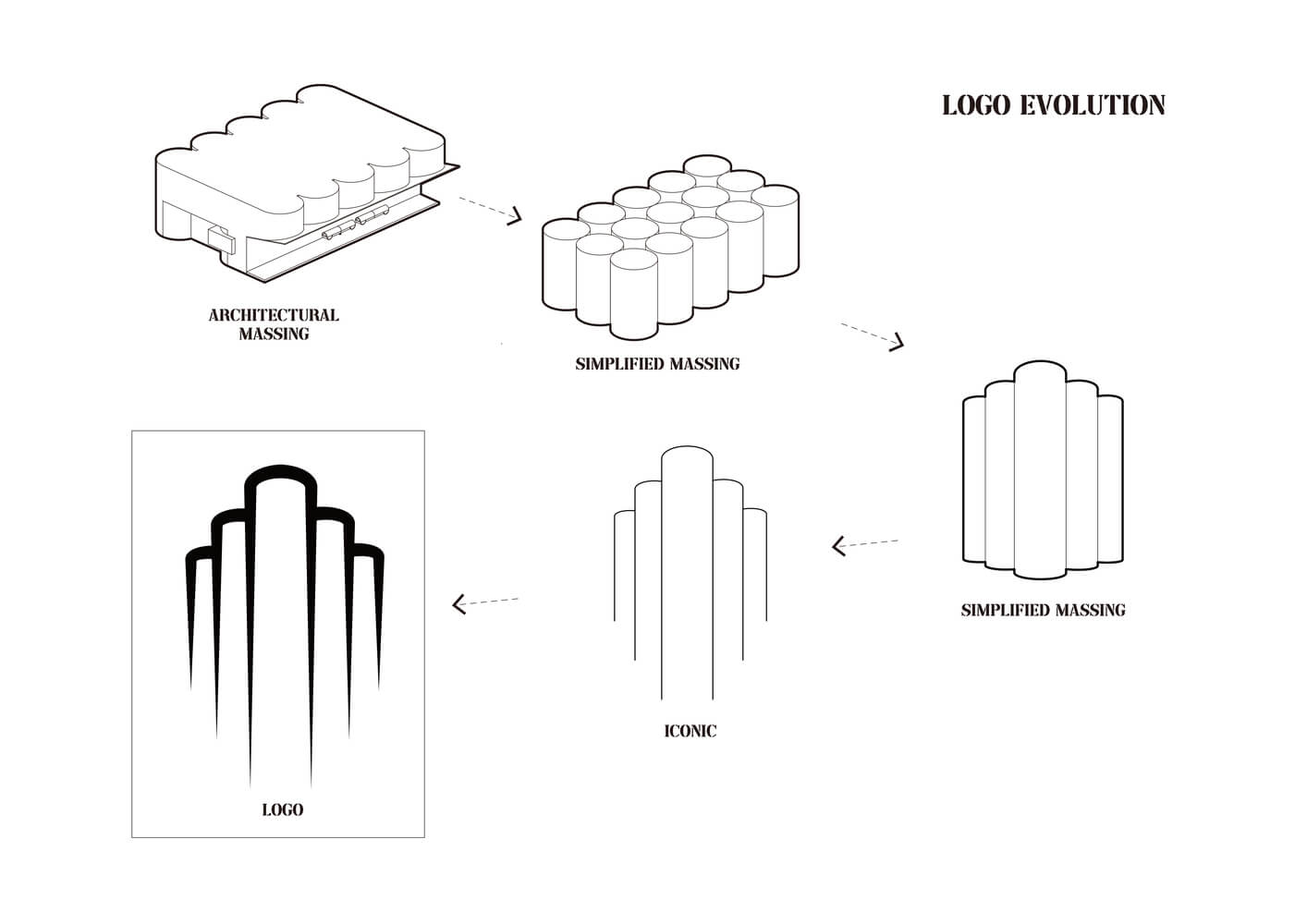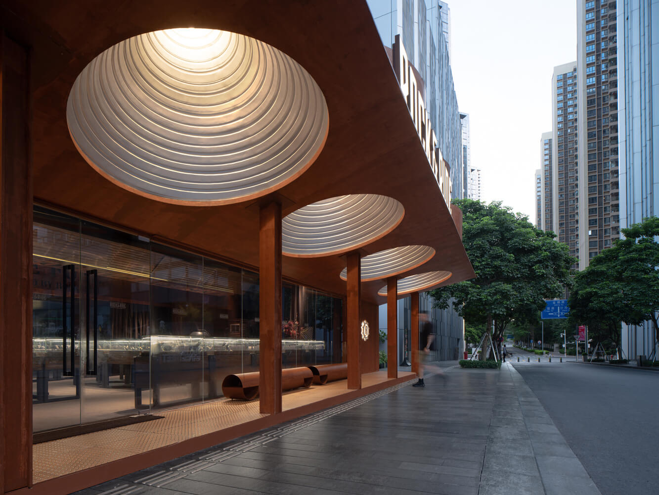 We first use weathered steel cylinders to cover the entire site. The canopy over the site has a cantilevered trend facing the main street. We adapt to this trend by setting the main facade of the building back to the edge of the canopy's inclined columns. The ground is partially raised, extending to the site's boundary, maximizing urban open space. The upper volume of the main facade extends outward and is intersected by a sloping surface facing the main street, revealing the interior cavity of the cylinder. Inside the cavity, a conical metal inner wall is installed, resembling the shape of a jet, and paired with flame-like lighting to illuminate the front entrance space, creating a strong atmosphere. The slight lift of the cantilevered portion of the main facade ensures that pedestrians on the main street can see the expression of the facade, maximizing the presentation of the facade's tension. The back facade of the building faces a tranquil garden, and therefore, this facade is treated with a subdued and dignified approach.