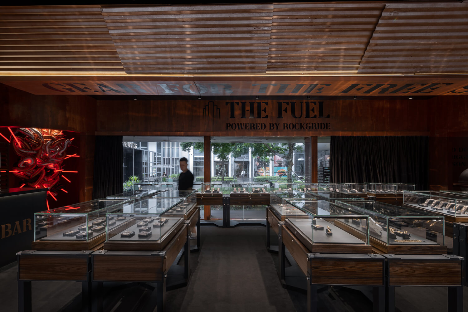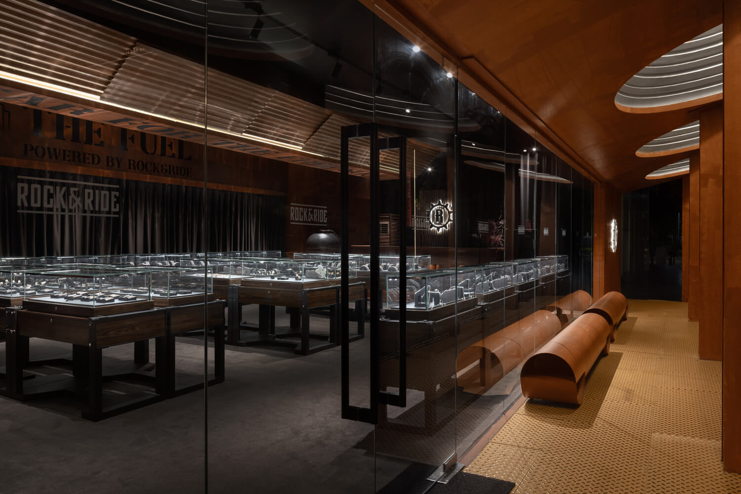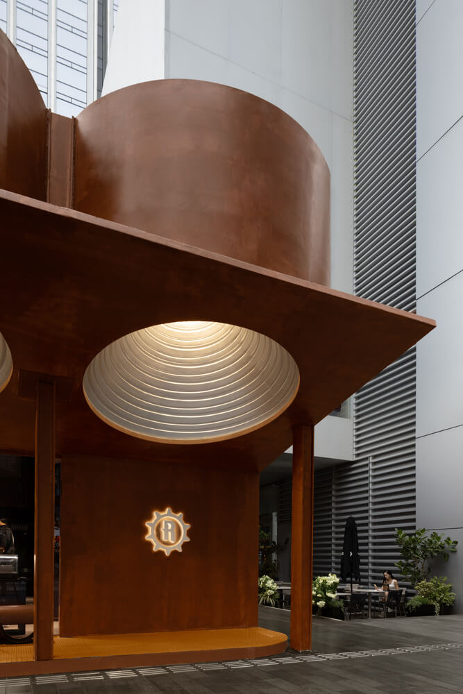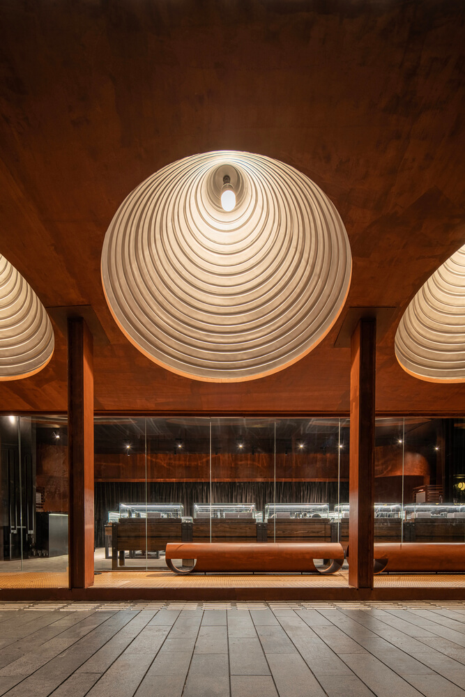 The interior layout adopts an efficient arrangement, with display cabinets along the walls to maximize product visibility. In the nodal areas of the circular circulation, external cylindrical elements are inserted into the interior, echoing the architectural language and housing art installations within the cavities. Overhead, wave-shaped ceiling elements made from recycled corrugated panels outline the spatial direction, enhancing the rough texture that corresponds with the exterior facade. Mechanical heart and floral art installations created by artists compensate for the delicacy and fluidity that resonates with the jewelry, adding an artistic atmosphere and visual focal points to the interior space.
