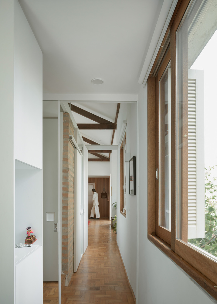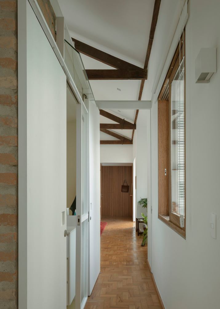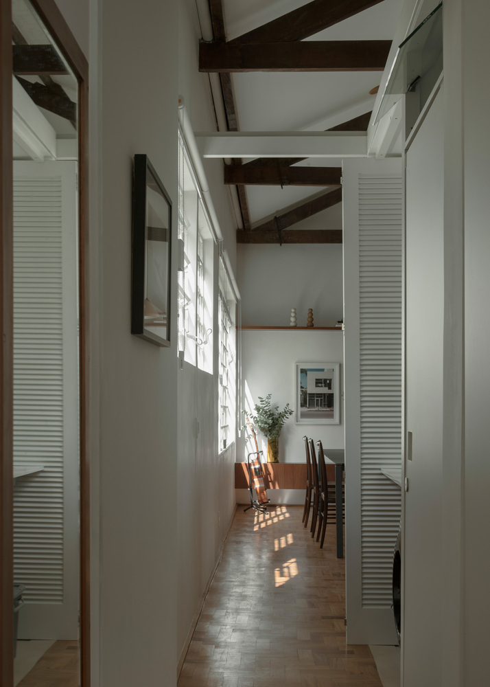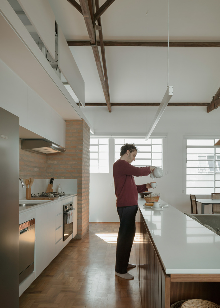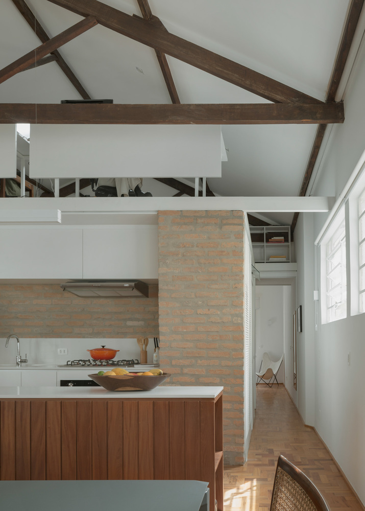 이 만남을 강조하기 위해 치장벽토를 철거하고 점토 벽돌의 일부를 재사용하여 주방, 욕실 2개, 세탁실 및 옷장을 포함하는 새로운 인프라 코어를 구축했습니다. 아파트의 둘레와 지붕에서 분리되어 자연광과 교차 통풍을 보장하기 위해 아파트 전체가 이 요소를 중심으로 회전하며 그 위에 금속 구조물도 배치되어 작업 공간을 위한 메자닌을 만듭니다.