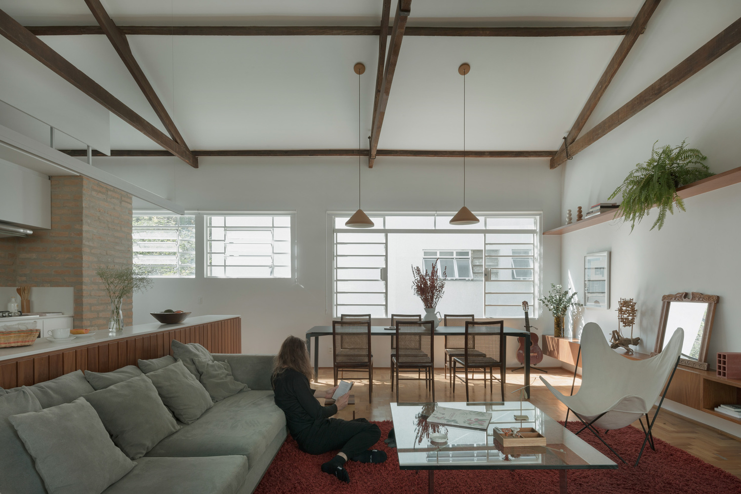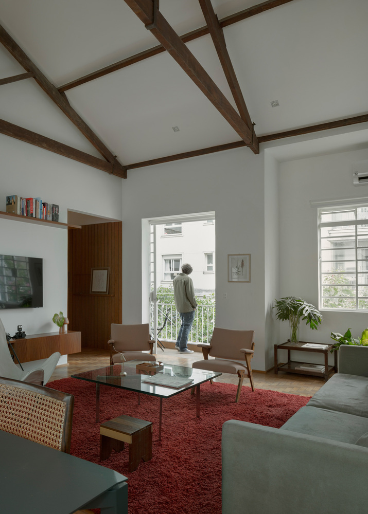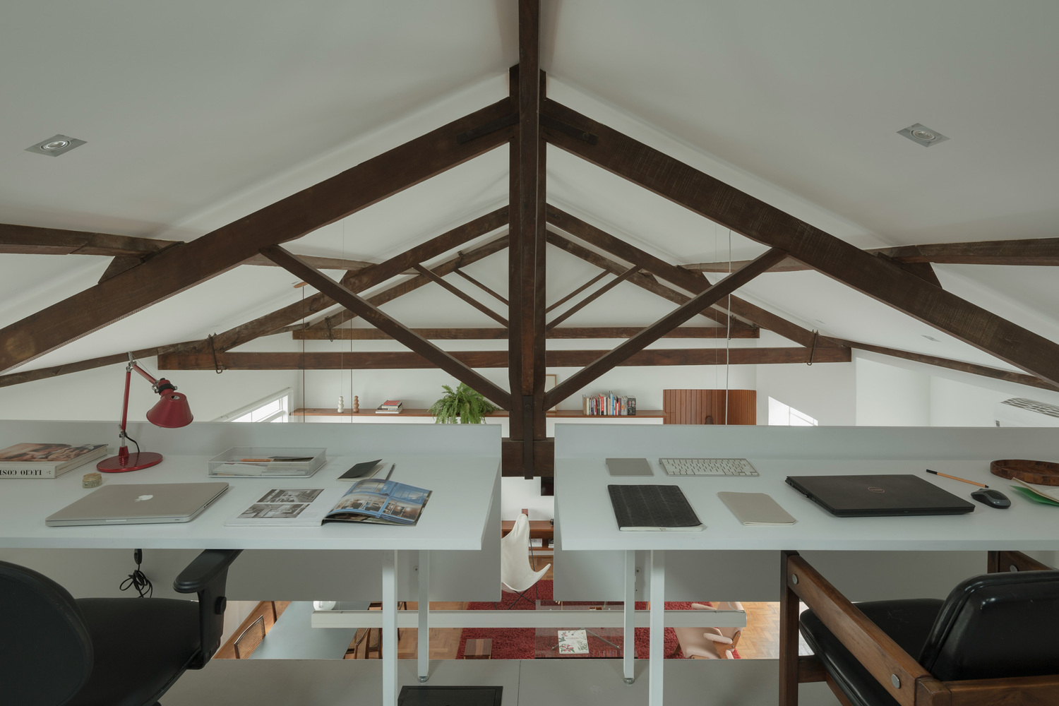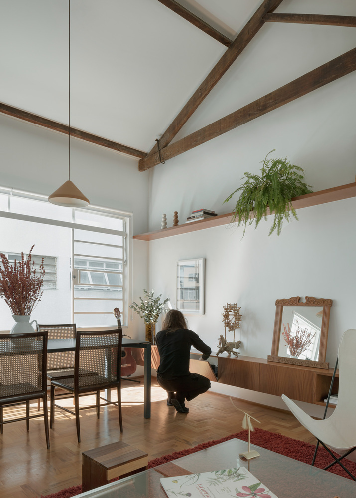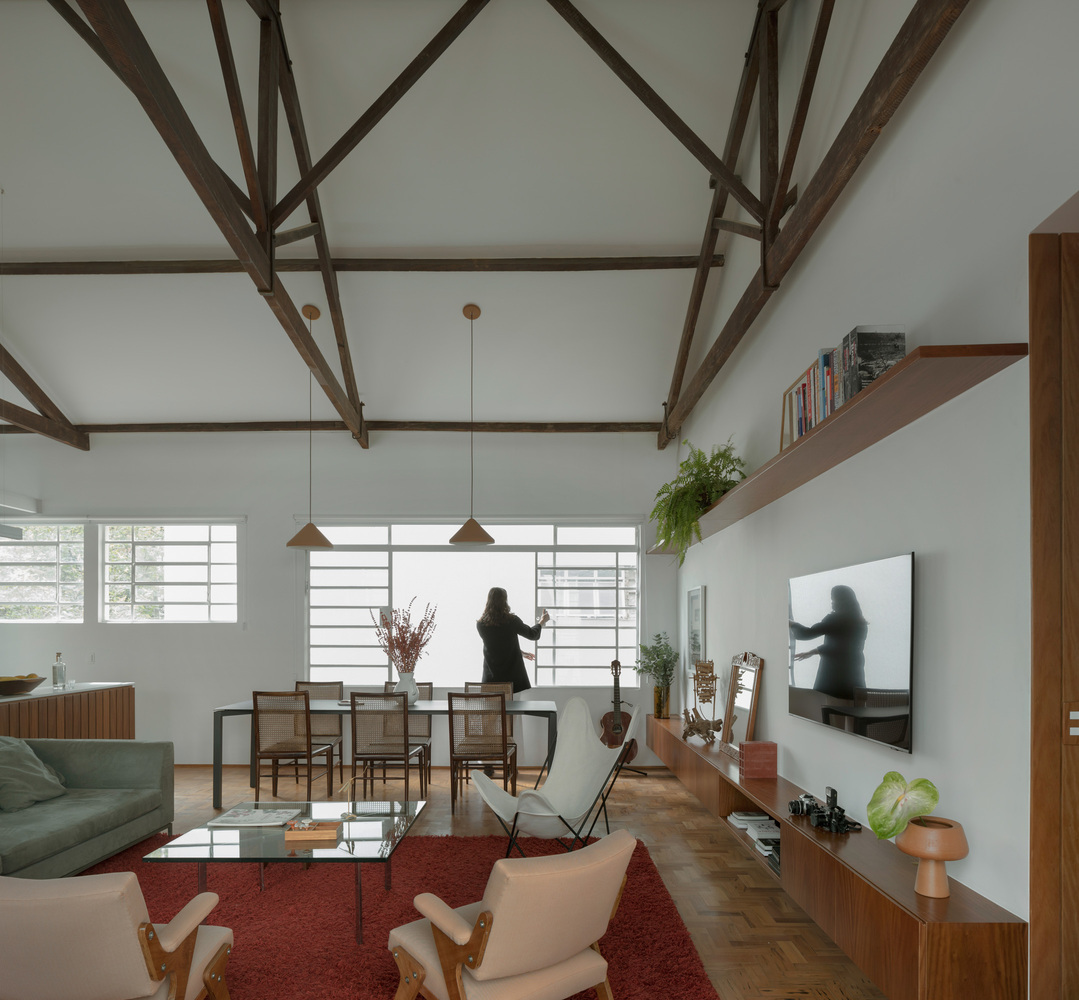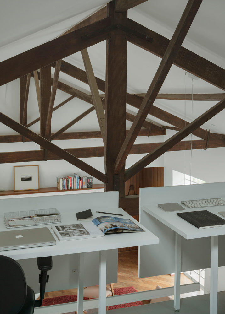인테리어 디자인 프로젝트는 리노베이션 과정에서 예상치 못한 요소를 만나는 것이 일반적입니다. 크라비뉴스 빌딩(Cravinhos Building)의 지붕은 수작업만이 이룰 수 있는 장인정신 수준인 조각 조인트와 타이로드가 있는 4개의 물 트러스 목조 지붕을 형성하였습니다.