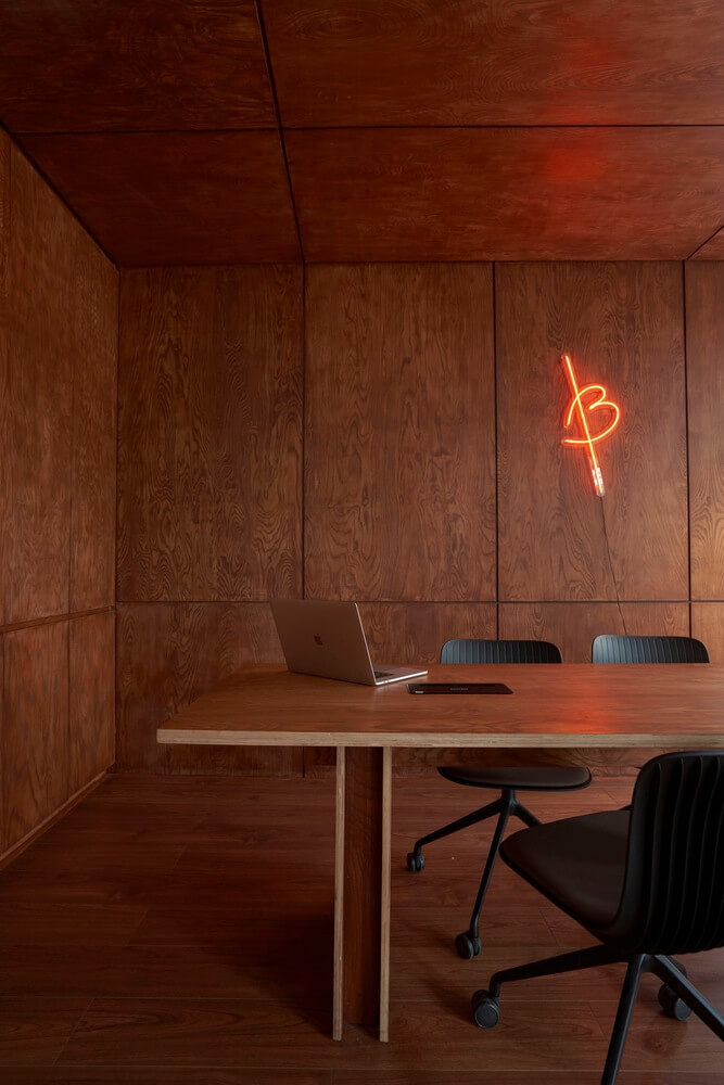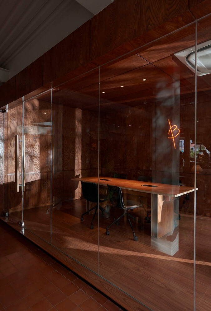 디자인은 단순하지만 붉은 원목 패널과 네온으로 브랜딩 이미지를 확고하게 연출하였으며 사람들의 눈길을 사로잡았습니다.