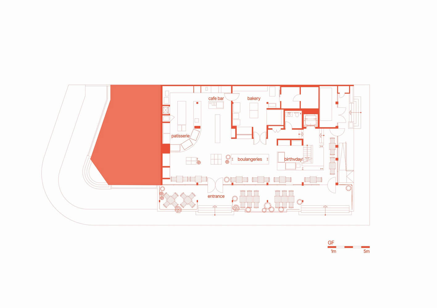 1층엔 고객이 쇼핑을 경험할 수 있는 Boulangerie & Patisserie가 있으며 위로 올라가면 호텔 라운지를 연상시키는 바와 라운지가 위치하여 맛있는 음식을 맛볼 수 있습니다. 최상층에는 직원공간과 연구공간이 존재합니다.