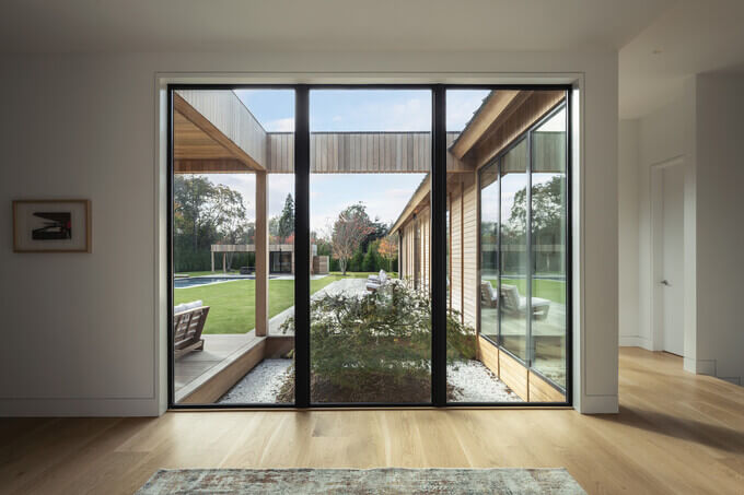 뉴욕 몬탁에 위치한 미니멀리즘 주택으로, 6개의 침실을 갖춘 2층 주택을 원하는 클라이언트의 의뢰를 받았습니다. 건축가들은 특히 여름철에 뉴욕 롱아일랜드의 주요 도로인 몬탁 고속도로에 노출될 가능성이 있다는 문제에 직면했습니다.