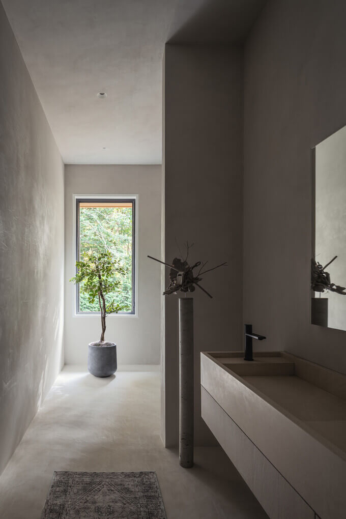 욕실은 세련된 디자인과 자연적인 요소를 결합하여 아늑하면서도 세련된 분위기를 연출합니다. 집 전체에 넓은 벽면 창문을 사용하여 자연광이 풍부하게 들어와 공간의 통풍이 잘되고 개방적인 느낌을 강화했습니다.