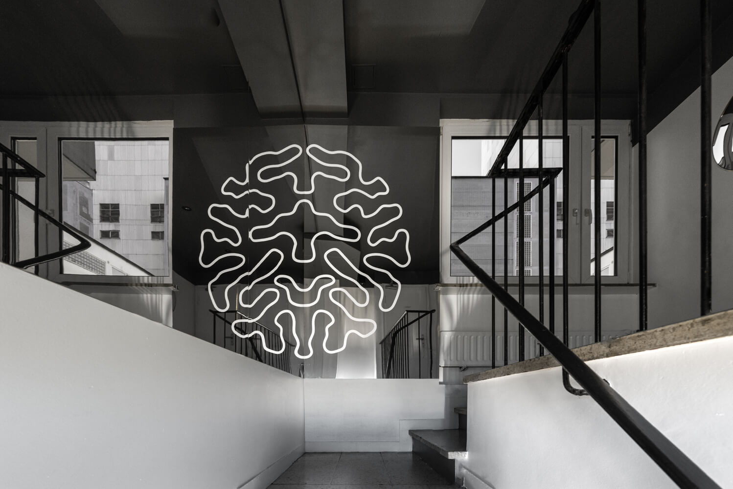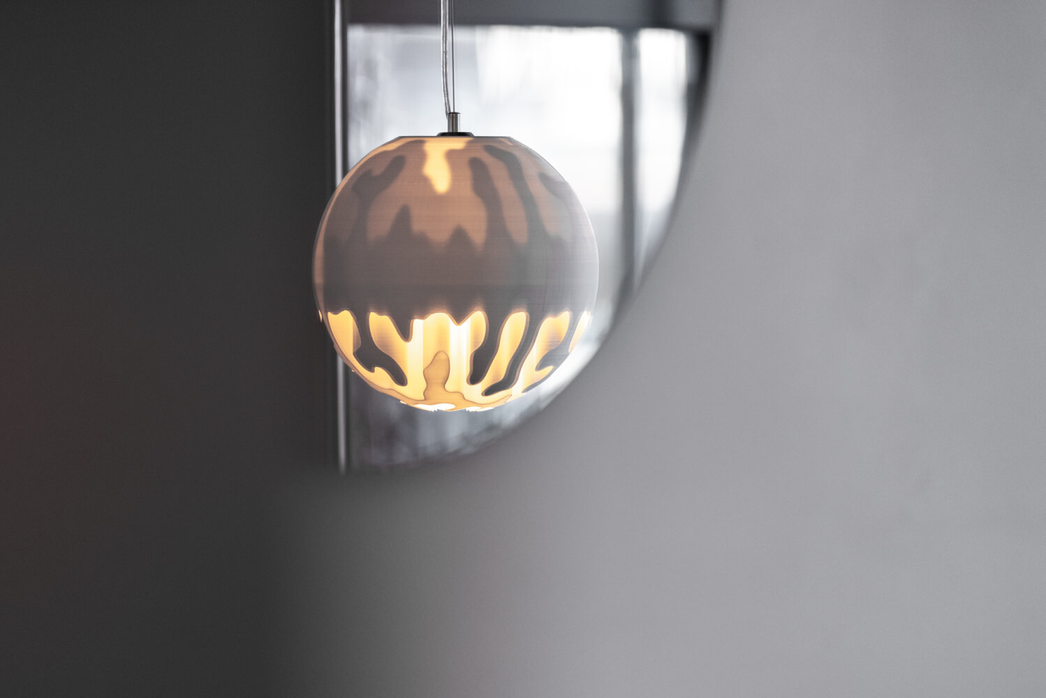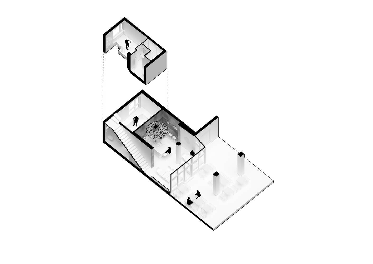 카운터는 공간에 세로로 배치되어 손님과 직원 사이의 경계를 없애줍니다. 맞춤 제작된 3D 프린팅 펜던트 조명 2개는 구와 성장 패턴의 언어를 모두 담고 있습니다. 현관으로 계단을 올라가면 손님은 또 다른 반원형 성장 패턴을 발견하게 되며, 거울로 된 벽 클래딩으로 보완되어 완전한 원을 만듭니다. 바에서 만들어지는 분위기로는 낮에는 환영하고 편안한 분위기, 밤에는 신비롭고 친밀한 분위기를 연출합니다.