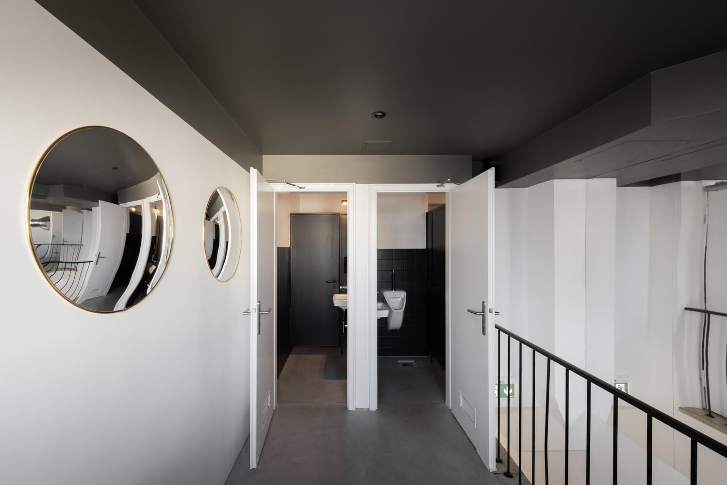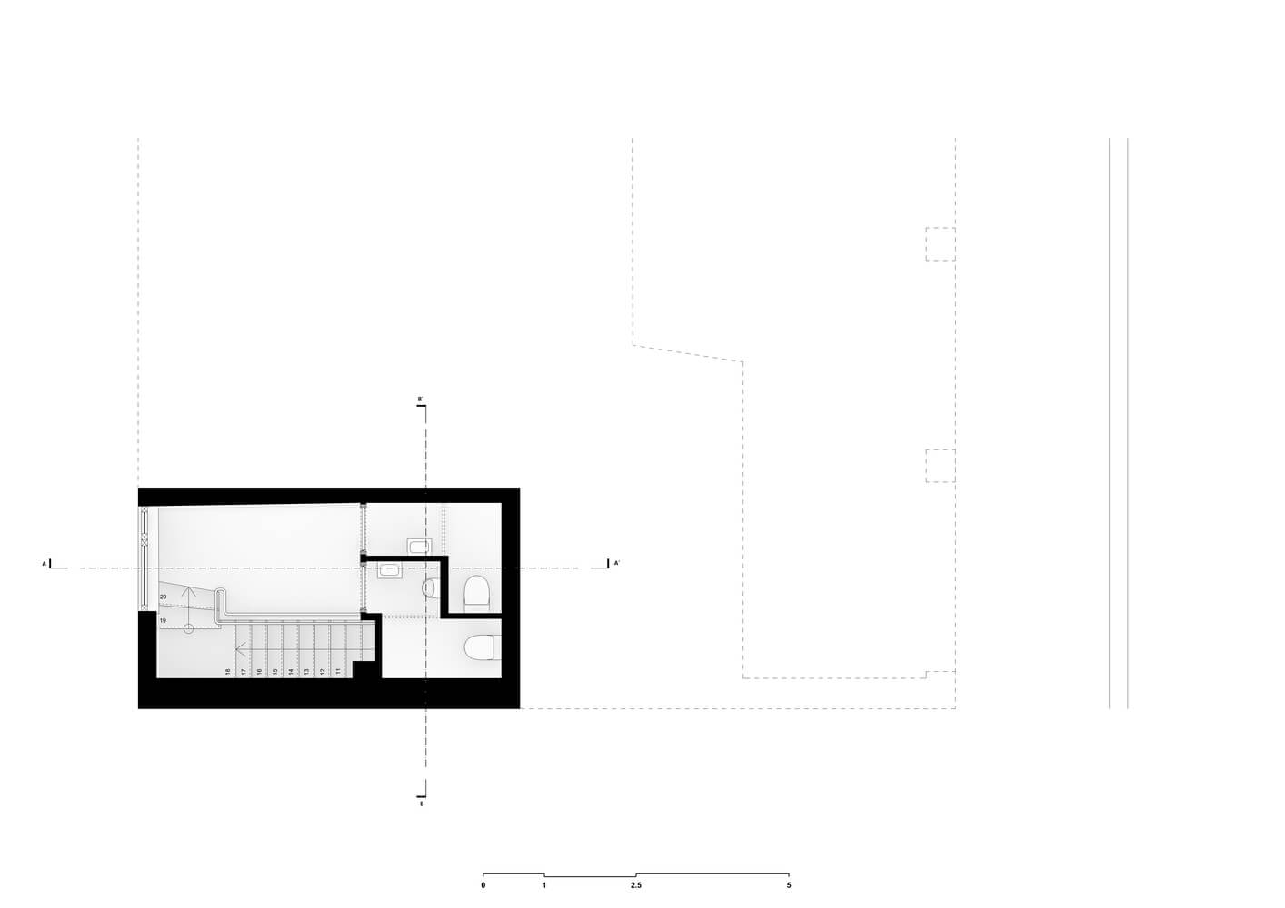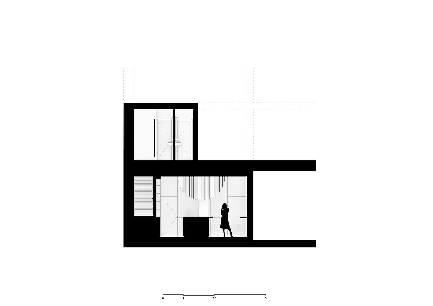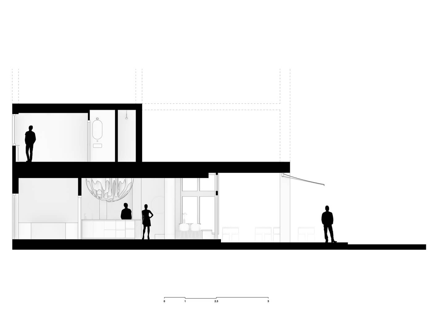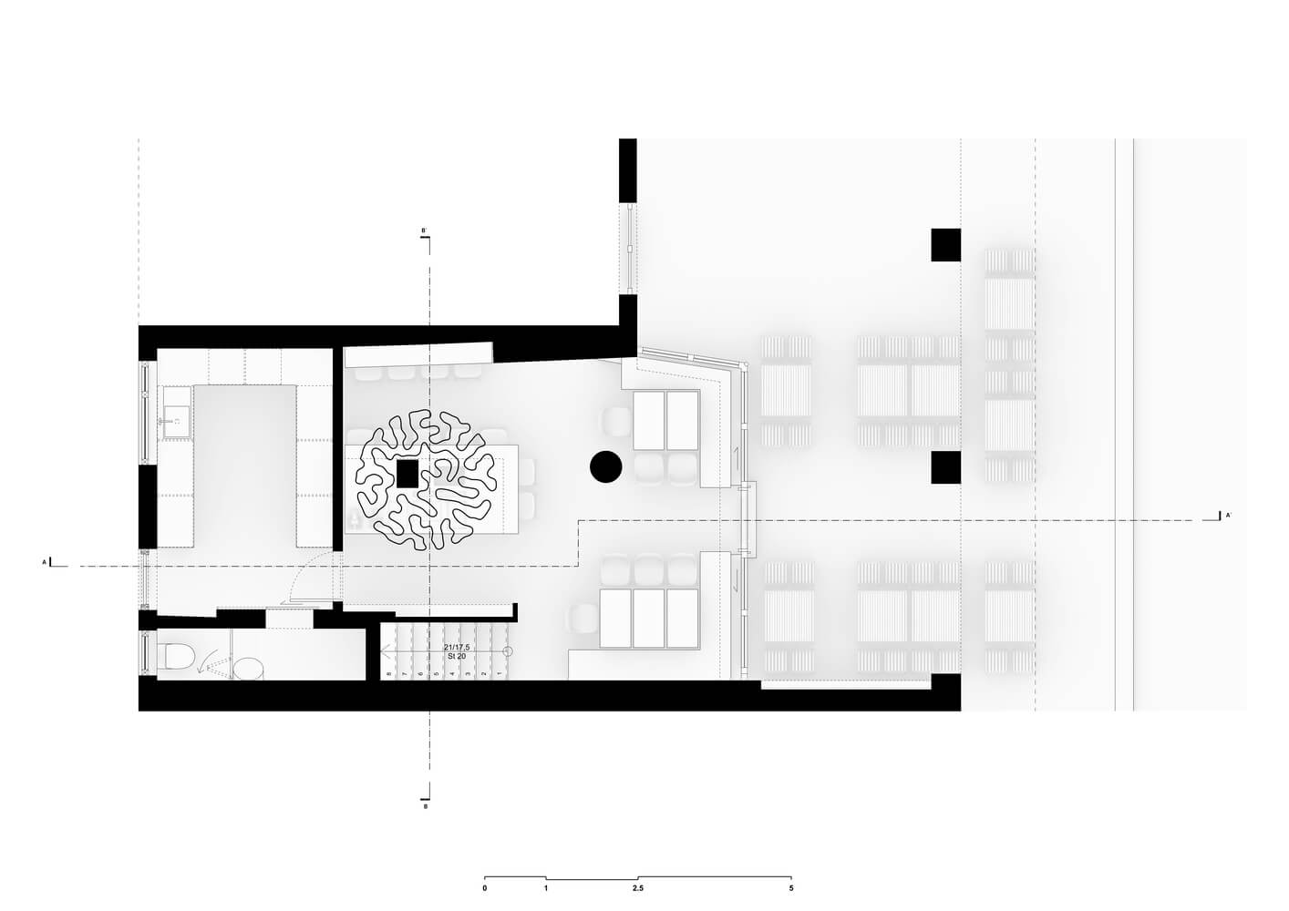 1층 공용 공간은 지붕이 있는 야외 테라스, 외부로 열리는 정면 옆의 식사 공간, 사교적인 오픈 바의 세 구역으로 나누어져 있습니다. 바 뒤쪽에는 일광이 거의 없기 때문에 두 내부 구역 사이에 명확한 공간 분리가 만들어졌습니다.
