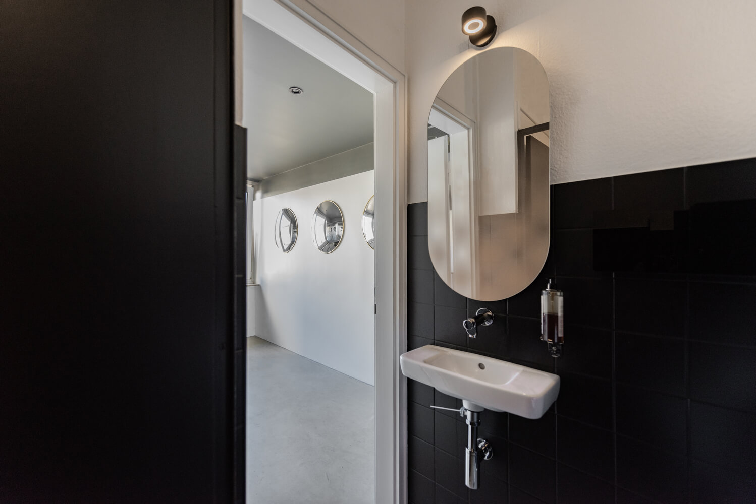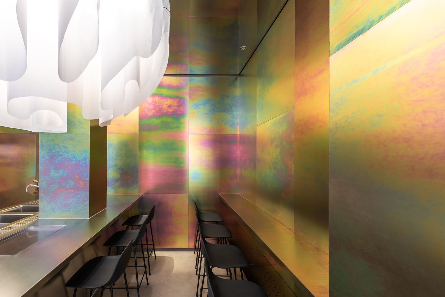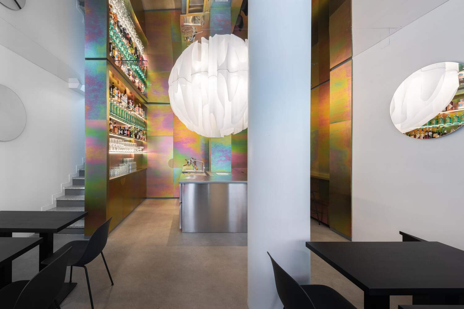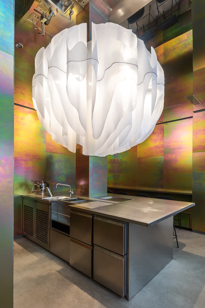 스테인리스 카운터와 크로메이트 스틸 패널로 둘러싸인 상부 조명 설치의 조합이 디자인의 중심입니다. 반구형 조명 설치는 "오픈 바" 위에 배치되며 손님들은 전체 구체를 인식하므로 높이가 두 배인 방의 환상이 원활하게 작동합니다.