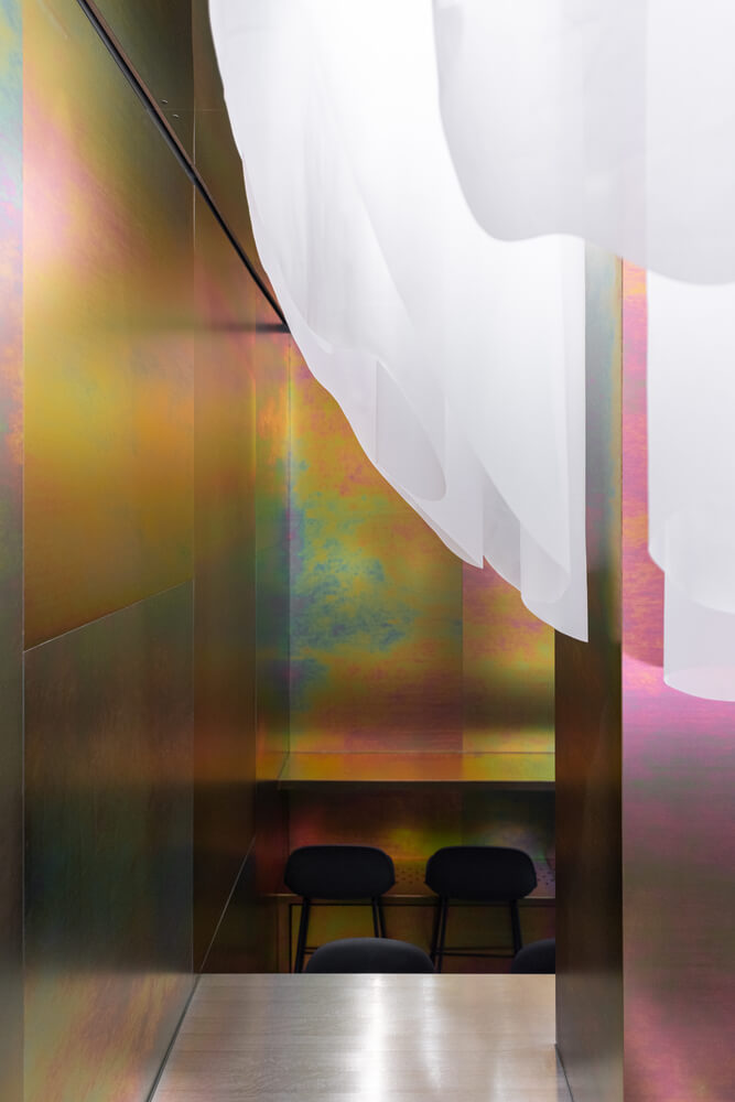 '방 안의 방'은 사라진 자연의 특성을 독특한 분위기로 대체합니다. 크롬 처리된 강철 패널은 제조 과정에서 발생하는 그러데이션과 색상을 가지며 소재의 독특함을 더해줍니다. 벽 클래딩은 프로젝트의 유일한 비단색 요소로서 폭발적인 색상을 통해 뒷방을 수많은 공간 경험이 있는 장소로 만듭니다.