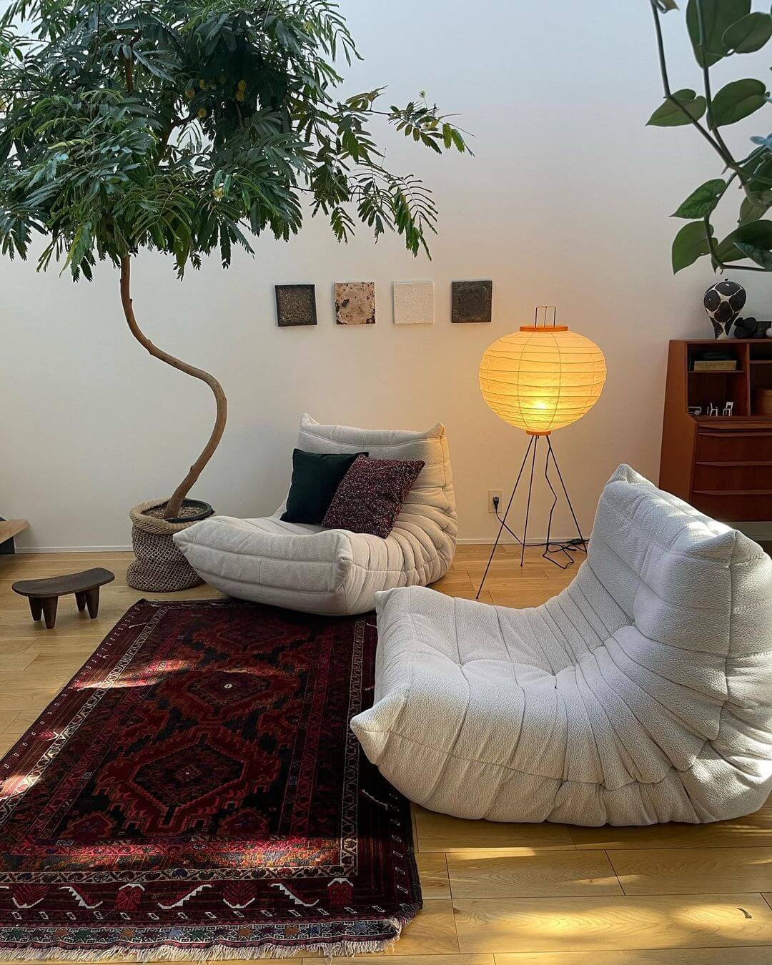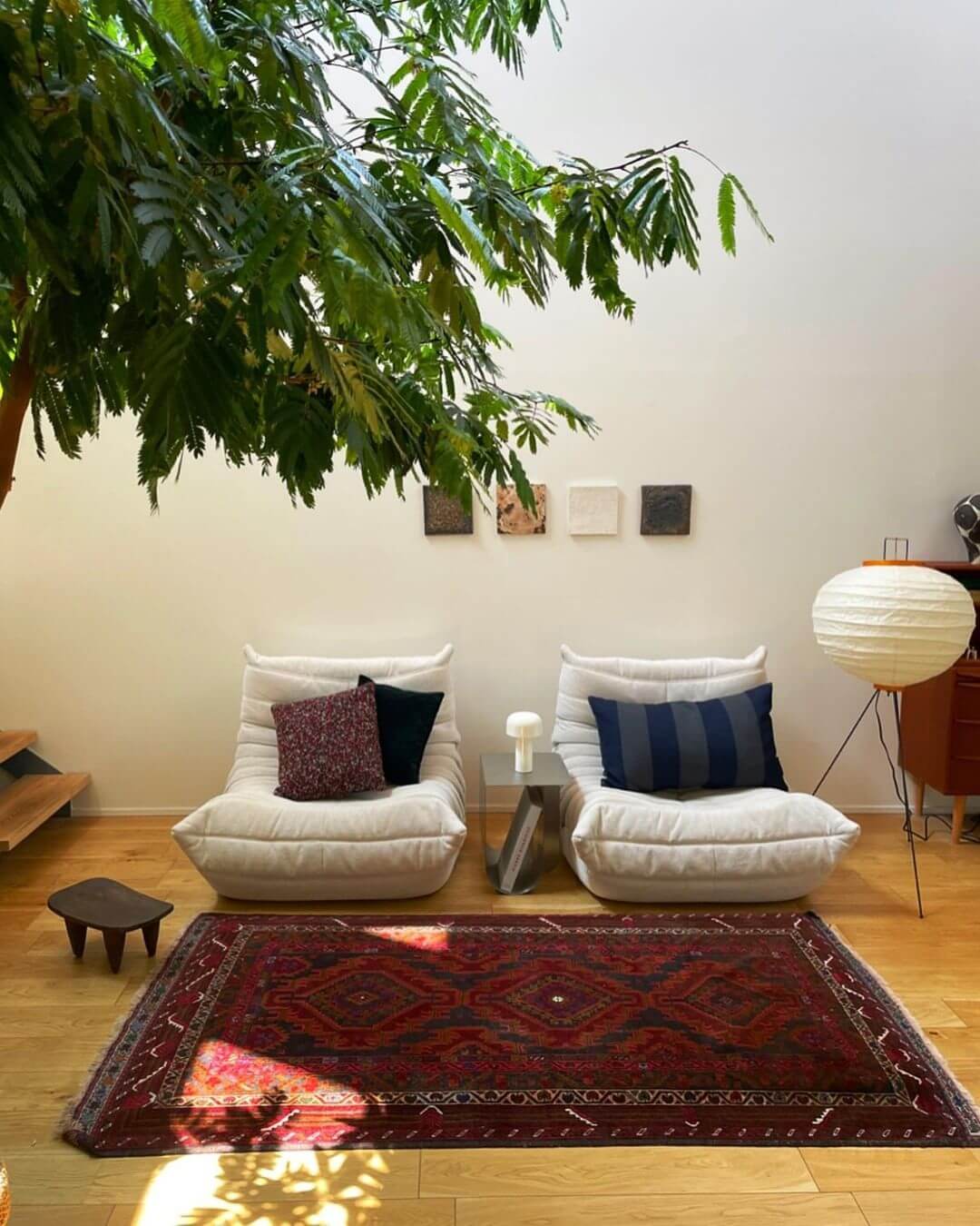 거실과 주방엔 러그로 인해 보헤미안 디자인이 떠오르게 만듭니다. 많은 가구를 배치하였으나 복잡하지 않고 차분한 분위기와 햇살이 더해져 고요한 인테리어가 완성됩니다.