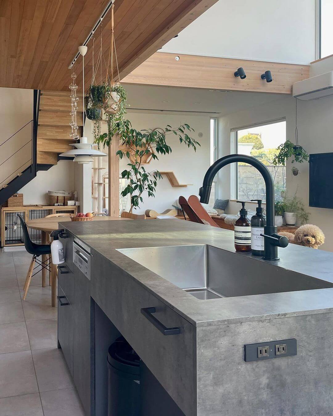 원목과 스톤 재질의 식탁이 있으며 천장은 우드 마감으로 포근한 주방 인테리어가 완성됩니다. 바닥으론 그레이 색상의 정사각형 타일을 깔아 정갈하면서 차분한 느낌이 듭니다.