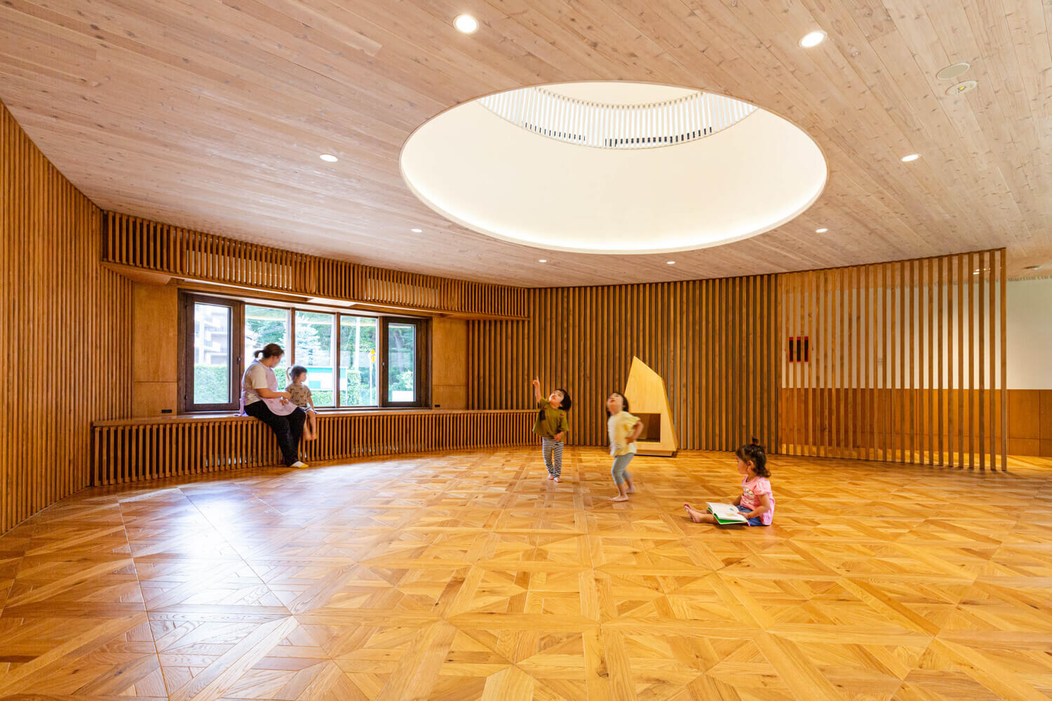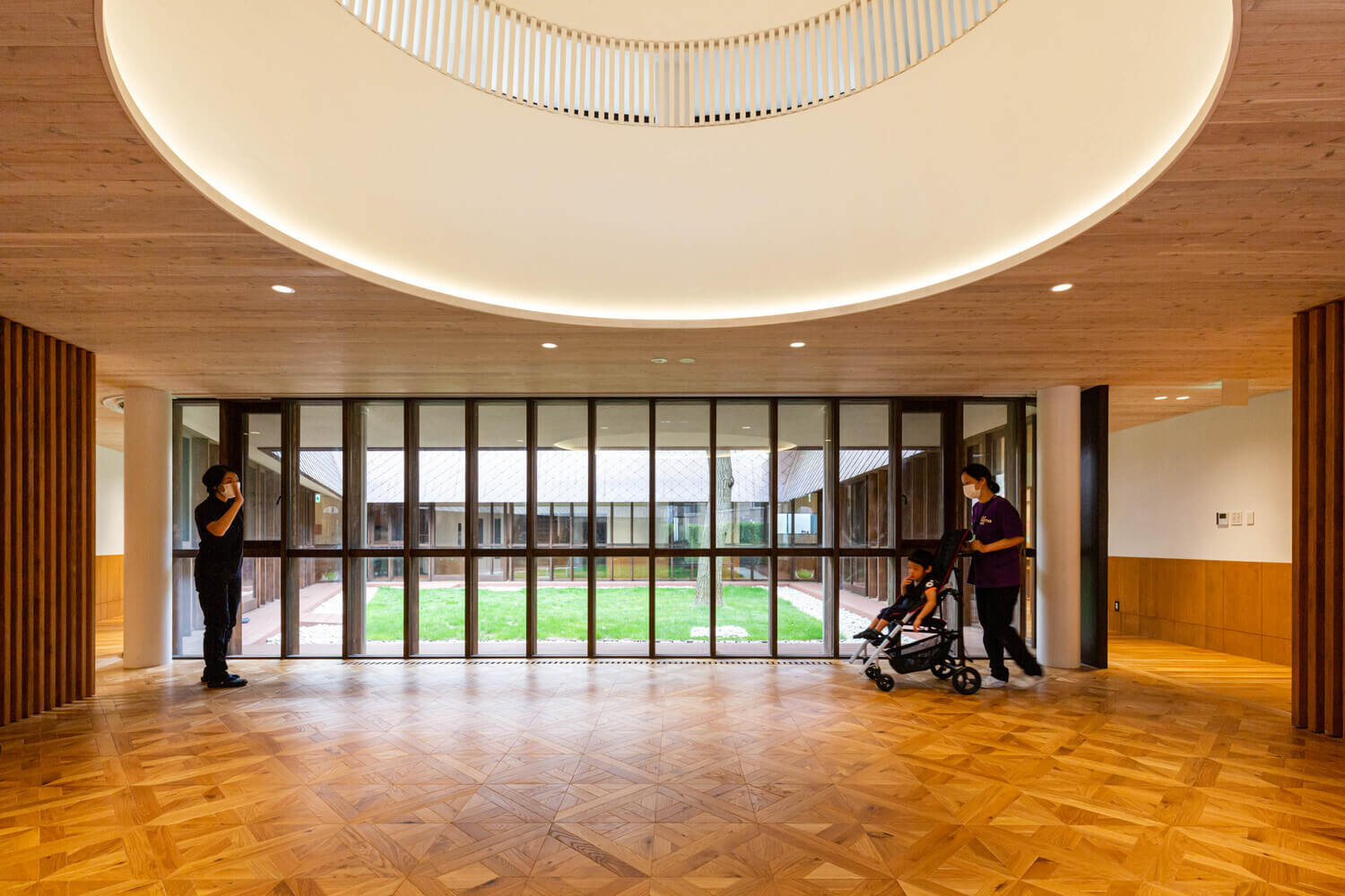 On the ground floor, child development support and nursery are located across the courtyard, allowing them to focus on rehabilitation and nursery. Halls, slides, and playground den are set up facing a circular corridor so that children receiving rehabilitation and children in the nursery can meet naturally as they move and play.