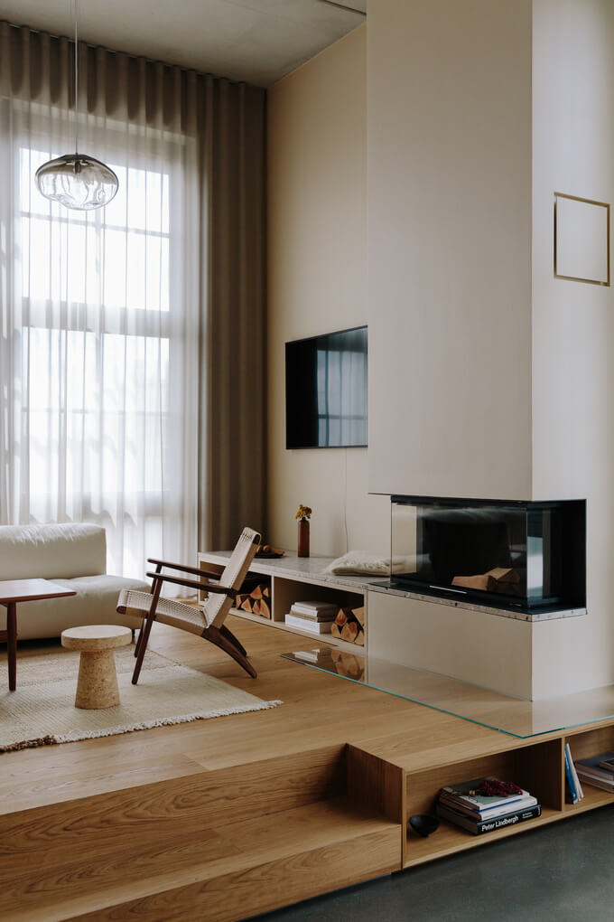 선정된 타운하우스의 상층부를 리노베이션 하여 넓은 창문과 4.5m의 높은 천장 덕분에 뉴욕의 로프트에 버금가는 개방감과 미적 매력을 지닌 넓은 거실로 효과적으로 탈바꿈시켰습니다. 이러한 변화는 공간과 빛을 강조하는 미니멀한 접근 방식에 중점을 두어 구조의 원래 디자인을 그대로 유지하면서 이루어졌습니다. 인테리어 자재 선택은 품질과 따뜻함을 우선시하여 세심하게 선별되었습니다. 목재는 디자인에서 중추적인 역할을 하며 공간 전체에 따뜻한 분위기를 조성합니다.