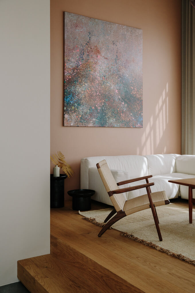 선정된 타운하우스의 상층부를 리노베이션 하여 넓은 창문과 4.5m의 높은 천장 덕분에 뉴욕의 로프트에 버금가는 개방감과 미적 매력을 지닌 넓은 거실로 효과적으로 탈바꿈시켰습니다. 이러한 변화는 공간과 빛을 강조하는 미니멀한 접근 방식에 중점을 두어 구조의 원래 디자인을 그대로 유지하면서 이루어졌습니다. 인테리어 자재 선택은 품질과 따뜻함을 우선시하여 세심하게 선별되었습니다. 목재는 디자인에서 중추적인 역할을 하며 공간 전체에 따뜻한 분위기를 조성합니다.