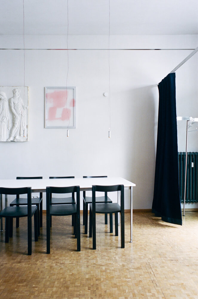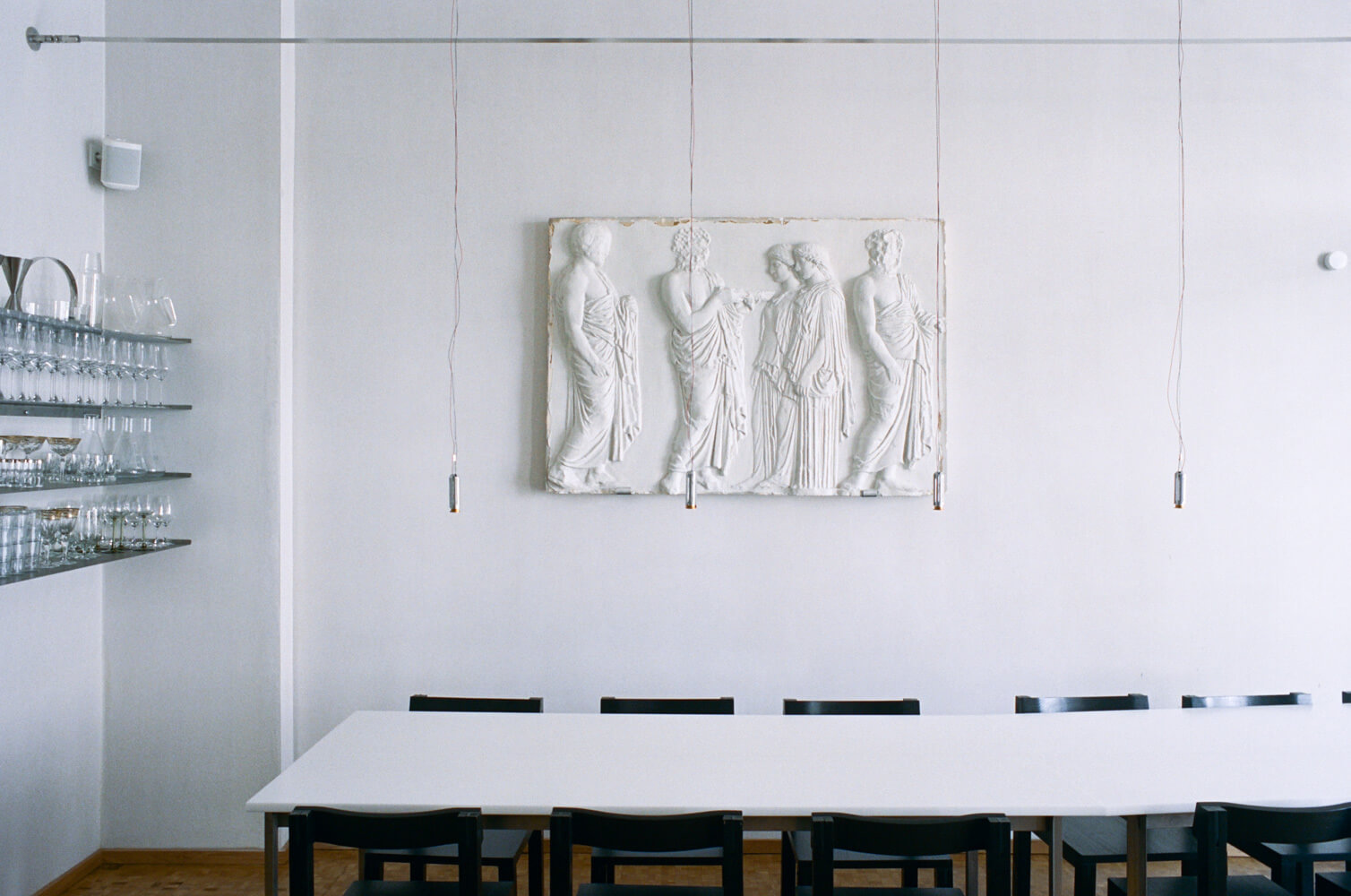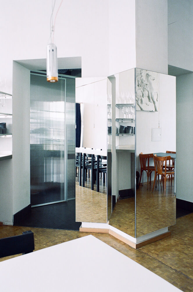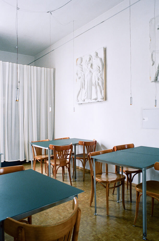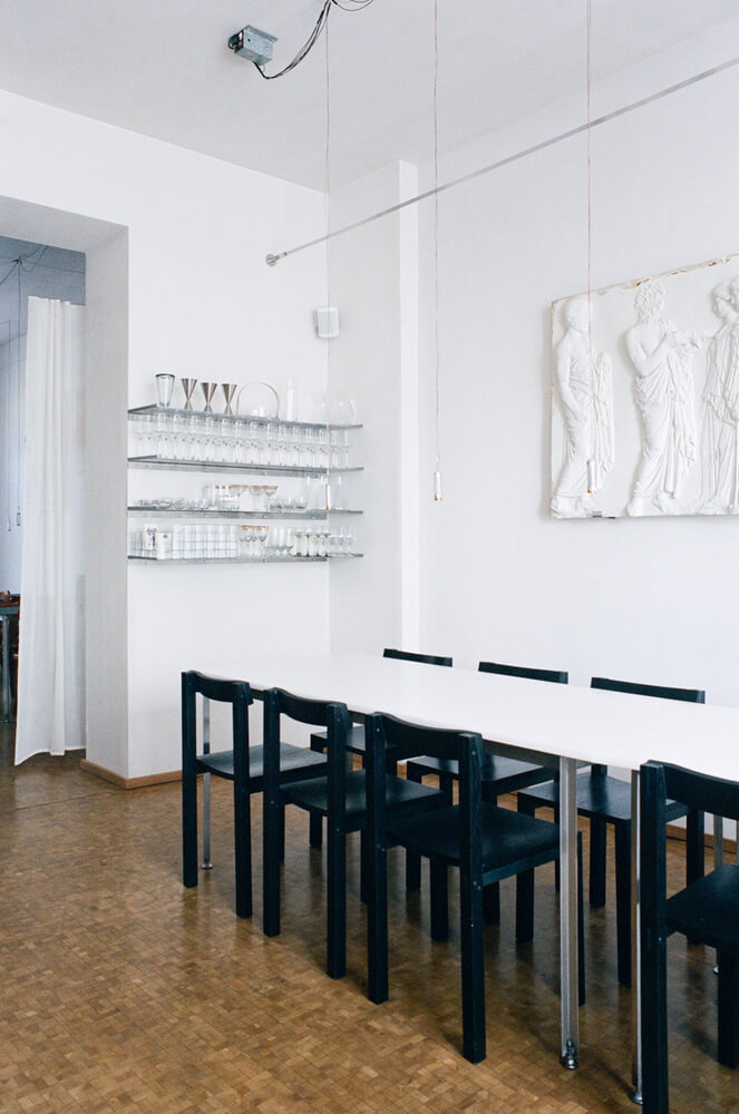 레스토랑 벽에는 이전 공간에서 사용된 골동품 느낌의 석고 모형을 그대로 전시하였으며 이는 Sarah Loibl, Hannah Sophie Dunkelberg, Pujan Shakupa, Malte Bartsch, Felix Weppen의 현대작품들과 대조를 이룹니다. 그 결과 오래된 것과 새로운 것, 편안함과 식사, 질감이 있는 미니멀리즘이 결합된 레스토랑으로 요리 실험 장소로 발전하는 순간을 반영합니다.