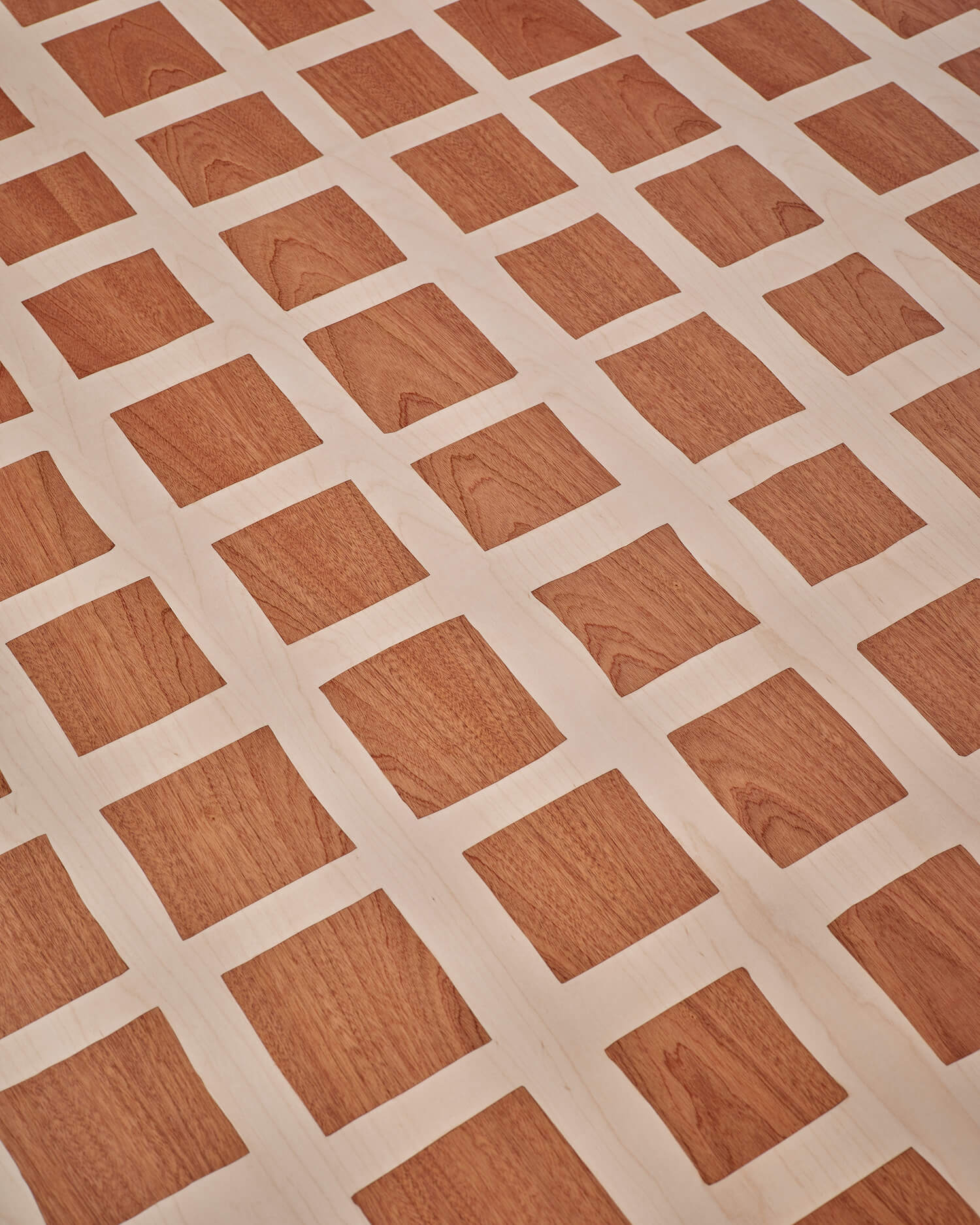Square Table은 뉴욕을 기반으로 활동하는 디자이너 Sam Stewart가 디자인한 미니멀 테이블입니다. 이 작품은 두 개의 서로 다른 나무 베니어판을 꼼꼼하게 손으로 그린 후 레이저로 절단한 격자 패턴이 특징입니다.