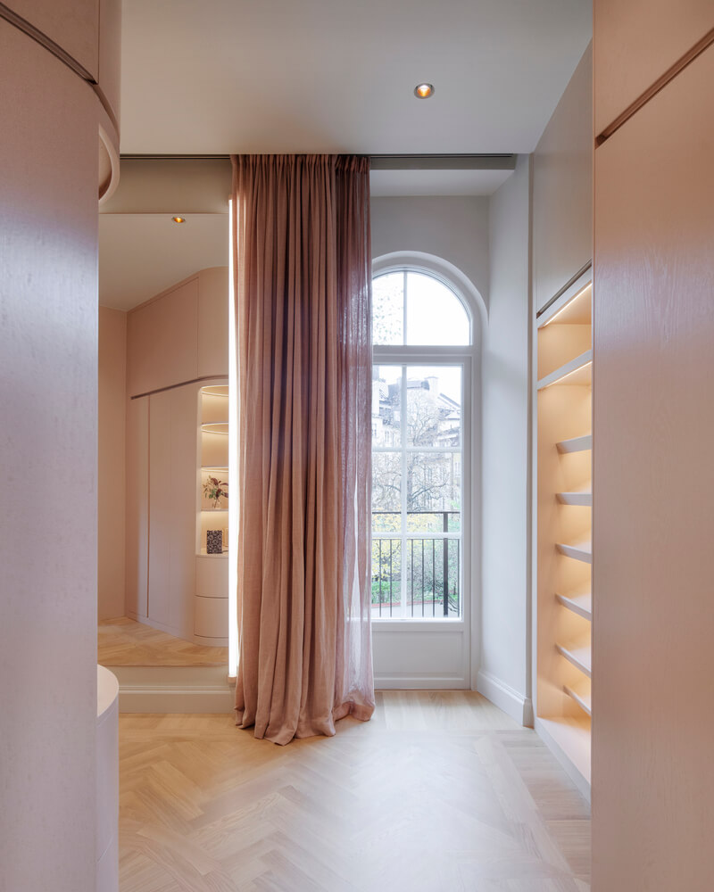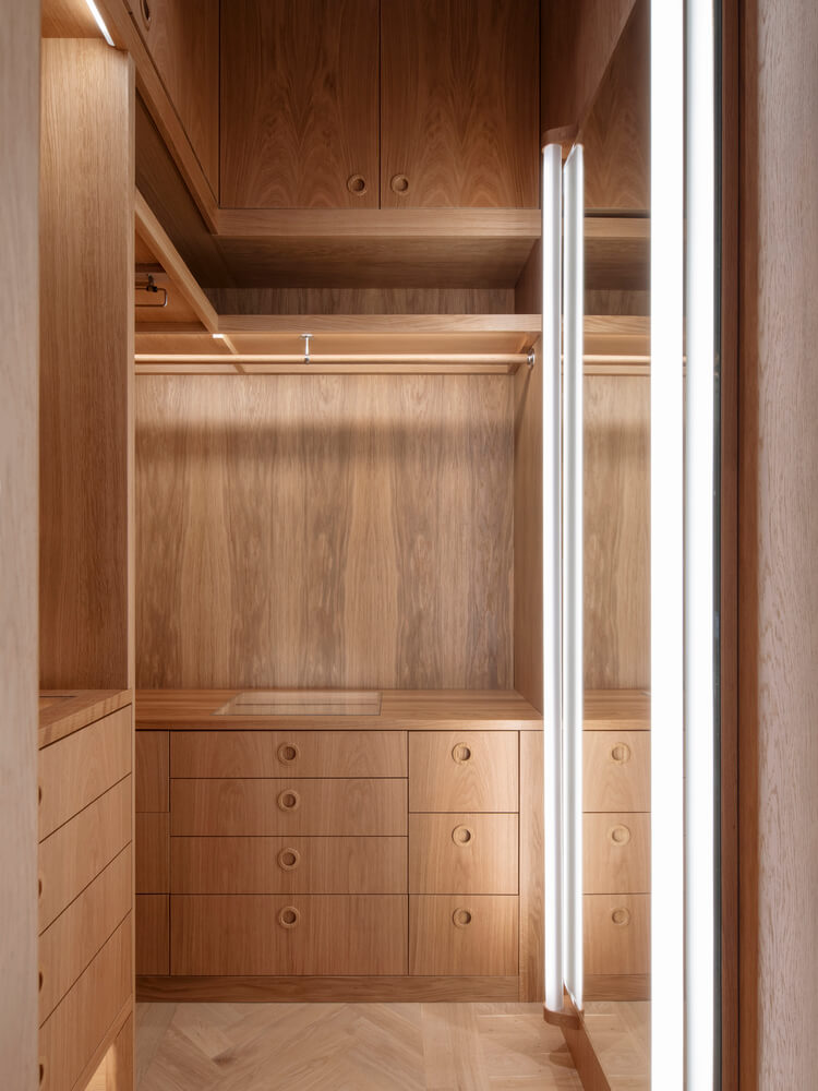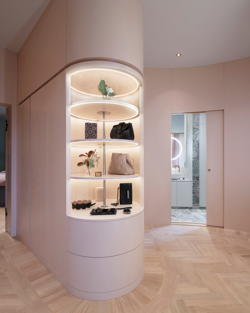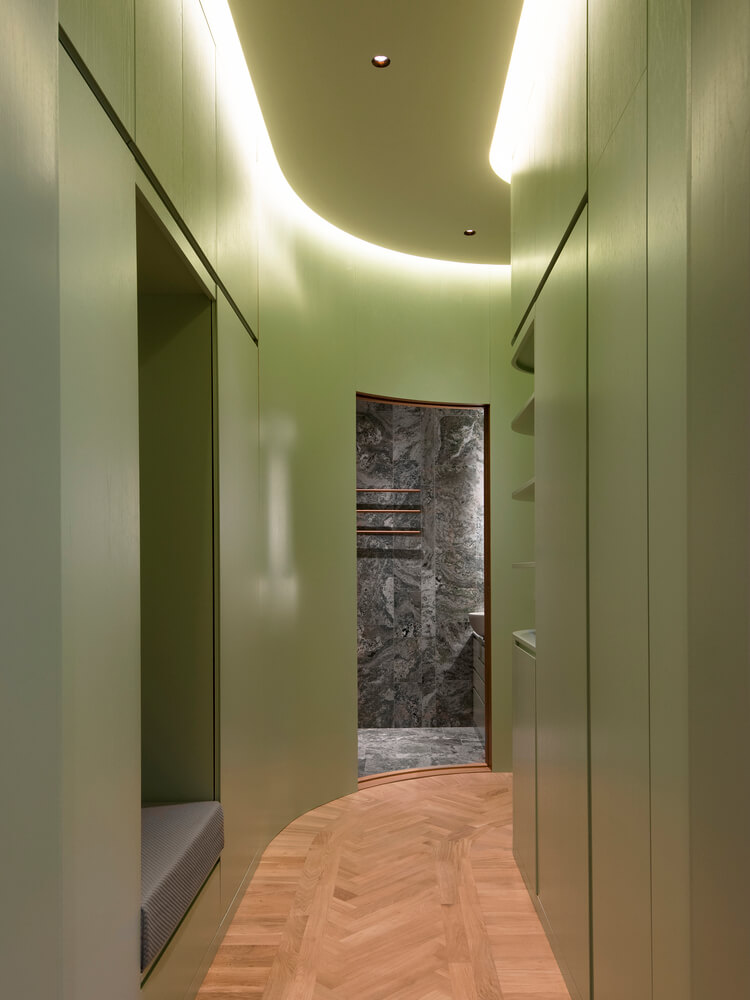 패널로 마감된 숨겨진 문 뒤에는 옷장이 있는 곡선형 복도가 터널처럼 역할을 하면서 마스터 침실로 이어지며 어머니의 넉넉한 대형 옷장과 욕실로 이어집니다. 욕실 벽 중 2개는 곡선형으로 되어 있으며 슬라이딩 도어가 내장되어 있어 좁은 공간을 최대한 활용할 수 있습니다. 10대 딸은 침실, 거실, 욕실, 대형 옷장을 갖춘 별도의 구역을 갖고 있습니다.
