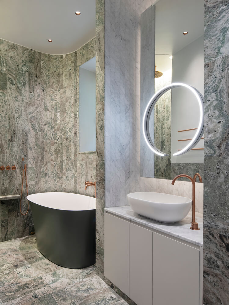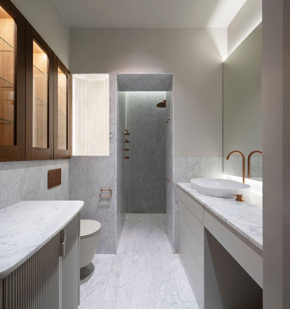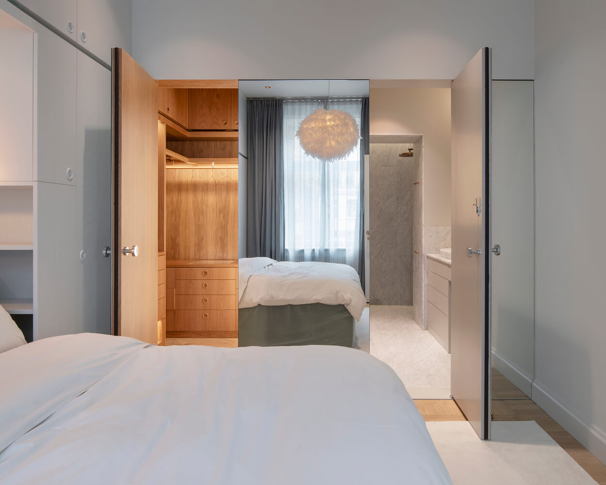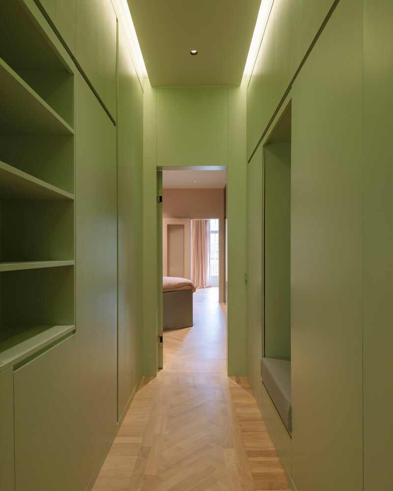 패널로 마감된 숨겨진 문 뒤에는 옷장이 있는 곡선형 복도가 터널처럼 역할을 하면서 마스터 침실로 이어지며 어머니의 넉넉한 대형 옷장과 욕실로 이어집니다. 욕실 벽 중 2개는 곡선형으로 되어 있으며 슬라이딩 도어가 내장되어 있어 좁은 공간을 최대한 활용할 수 있습니다. 10대 딸은 침실, 거실, 욕실, 대형 옷장을 갖춘 별도의 구역을 갖고 있습니다.