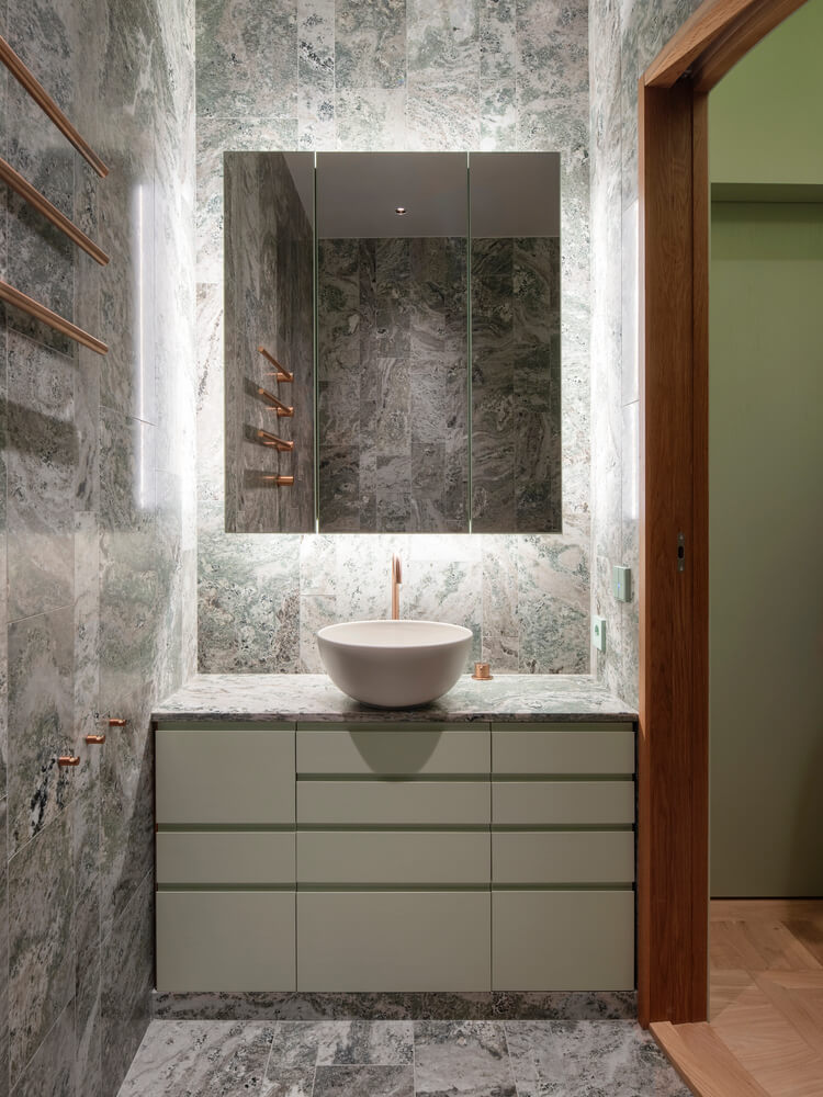 인테리어는 소박하고 편안한 분위기를 지향합니다. 고정 가구는 아파트에 맞게 맞춤 제작되었으며 재료 선택은 인근 콜모르덴(Kolmården)에서 가져온 참나무와 녹색 대리석으로 이루어진 집의 원래 팔레트를 보완합니다.