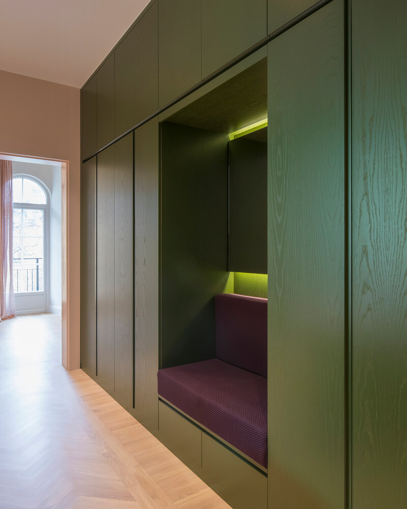 내부 복도의 캐비닛은 내부의 원래 표현과 유사하고 나머지 목공품은 현대적인 디자인 언어를 채택하여 오래된 것과 새로운 것 사이의 긴장감을 조성합니다.