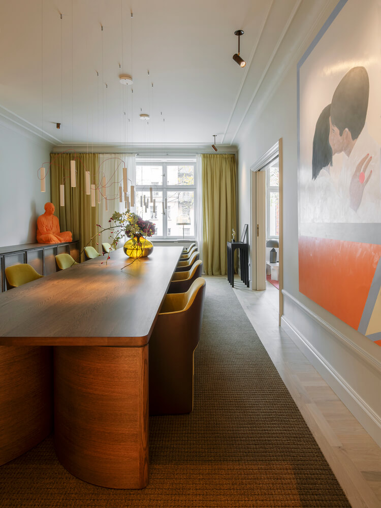 이 프로젝트에는 고정 가구 외에도 맞춤 제작 가구, 카펫, 커튼과 같은 느슨한 가구도 포함되었습니다. 벽과 천장은 다양한 회색 음영으로 칠해져 다채로운 추가 요소에 차분한 배경을 제공합니다.