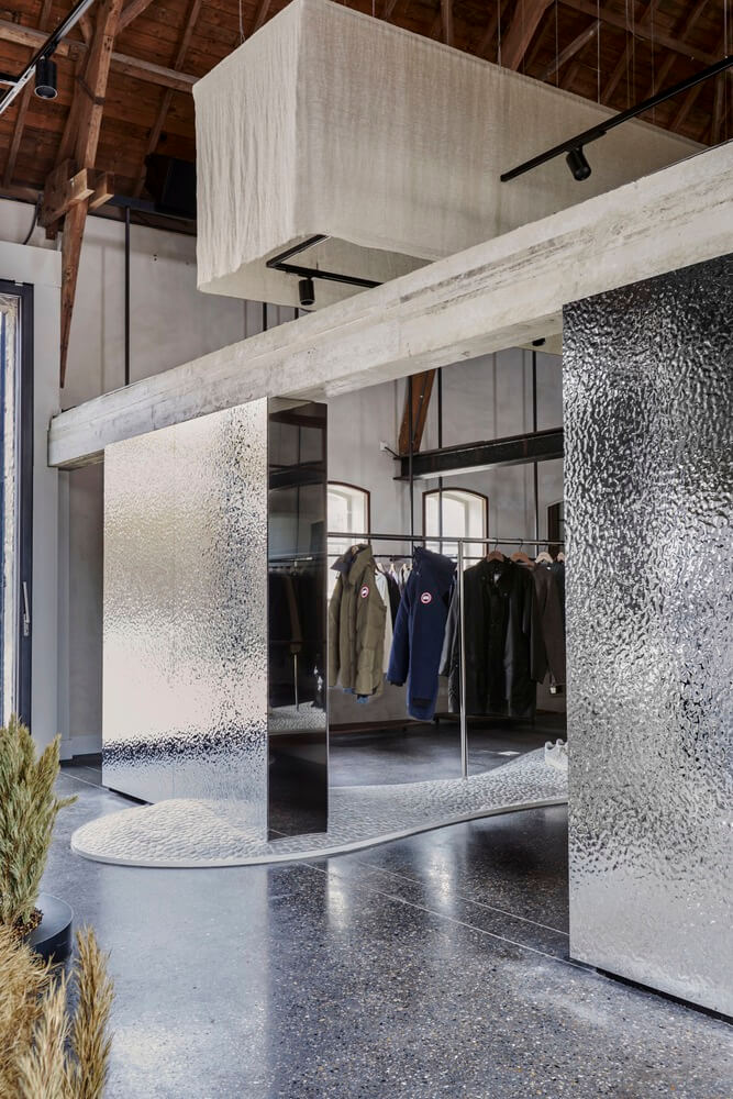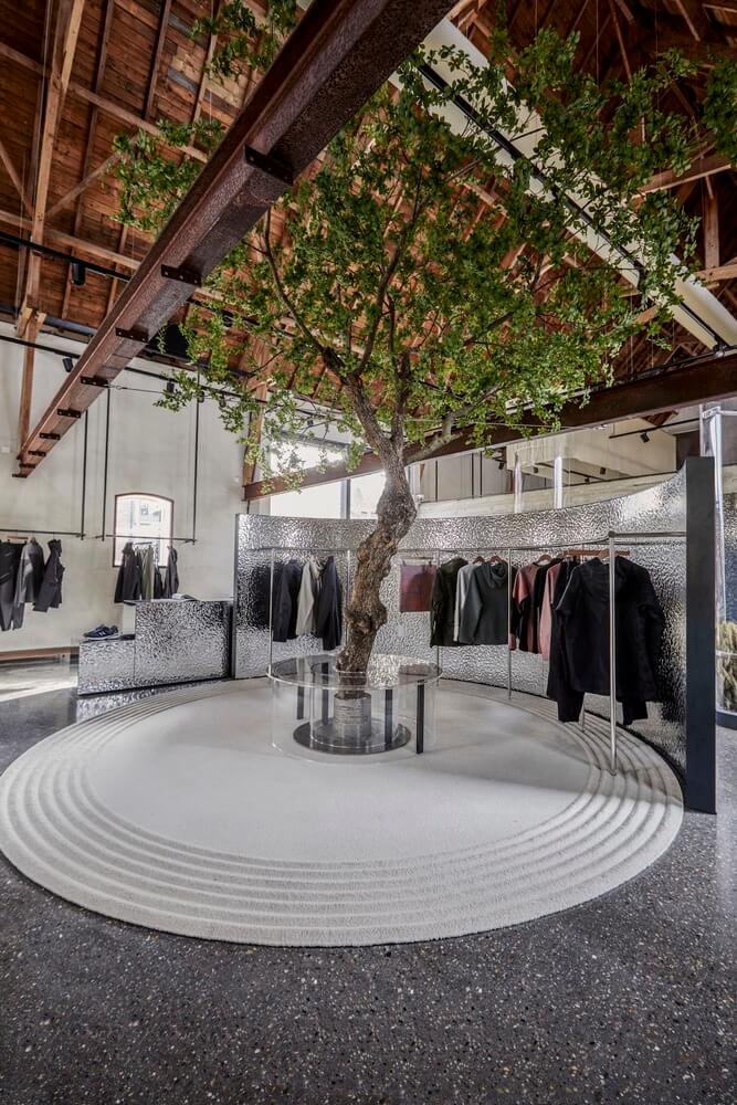 매장의 한 공간에 전시된 일본 나무는 원형 유리 벤치에 둘러싸여 있으며 맞은편의 피팅룸과 곡선 금속 시트 덕분에 주목을 받습니다. 또한, 매장 전면에는 건초로 둘러싸인 의류 컬렉션이 전시되어 있어 압도적이고 집중할 수 있도록 설계하였습니다.