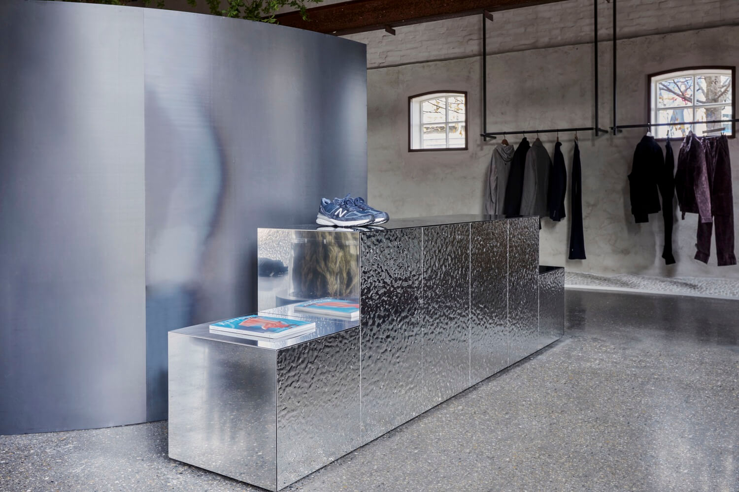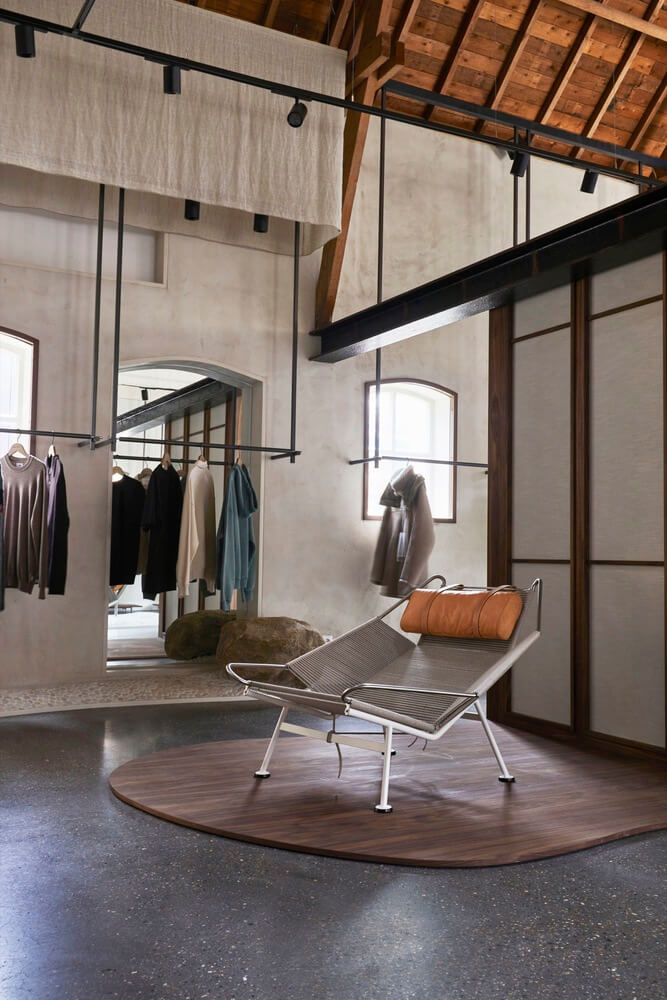 매장의 한 공간에 전시된 일본 나무는 원형 유리 벤치에 둘러싸여 있으며 맞은편의 피팅룸과 곡선 금속 시트 덕분에 주목을 받습니다. 또한, 매장 전면에는 건초로 둘러싸인 의류 컬렉션이 전시되어 있어 압도적이고 집중할 수 있도록 설계하였습니다.