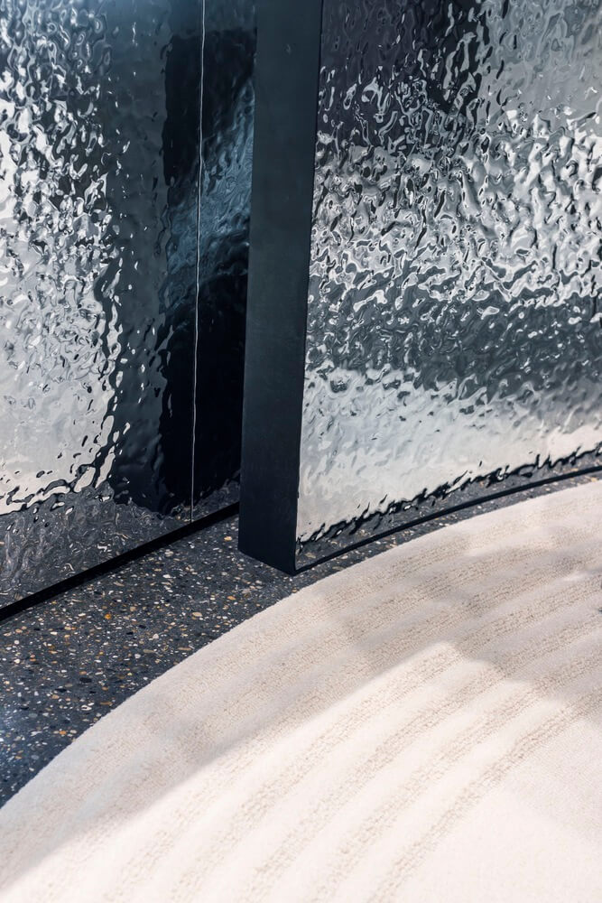 바위는 디스플레이 역할을 하며 콘크리트 바닥, 짙은 그레이 색상과 흰색 자갈을 사용하였습니다. 잔물결 디자인의 유리는 물을 형상화시켰으며 식물과 천장의 원목 재질은 일본 디자인을 연상하게 합니다. 맞춤형 카운터와 캐비닛, 피팅룸은 모두 호두나무로 제작되어 전통적인 분위기를 형성합니다.