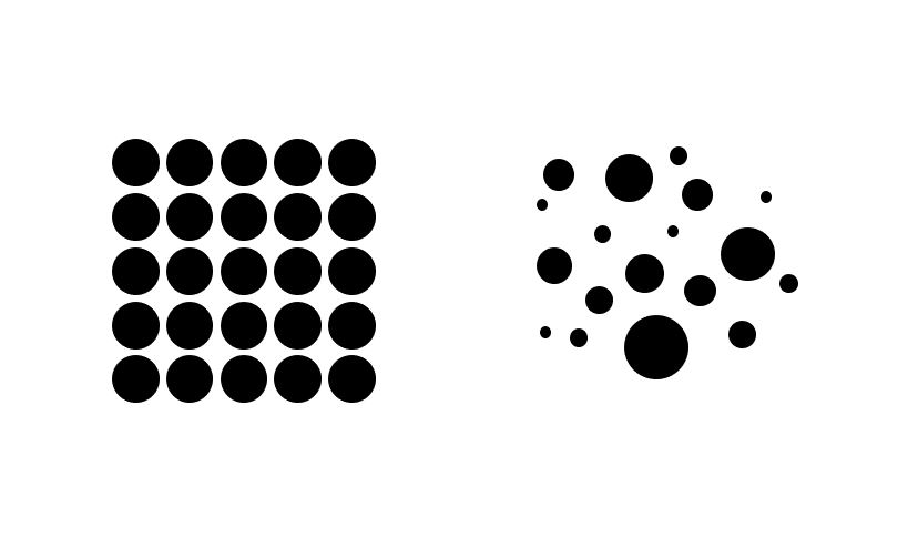 이때 점들의 크기가 같으면 정적인 느낌이 들지만, 오른쪽 이미지처럼 점들의 크기가 다르면 동적으로 느껴지게 됩니다.