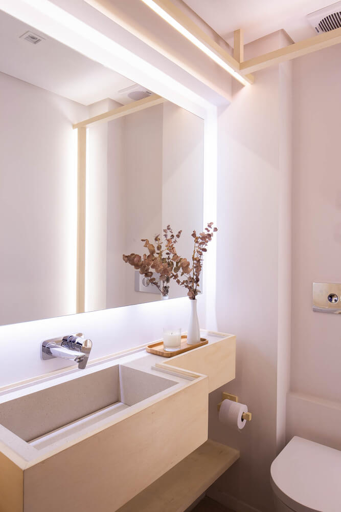 소셜 공간에는 Paricá의 천연 목재 가구 제조장과 조화를 이루는 미국산 참나무 바닥이 선택되었습니다. 외관의 원래 벽을 벗겨내고 흰색으로 칠해 주변 환경에 소박한 느낌을 더했습니다. 환경의 색상은 조경의 녹색과 장식의 작은 하이라이트로 제공됩니다.