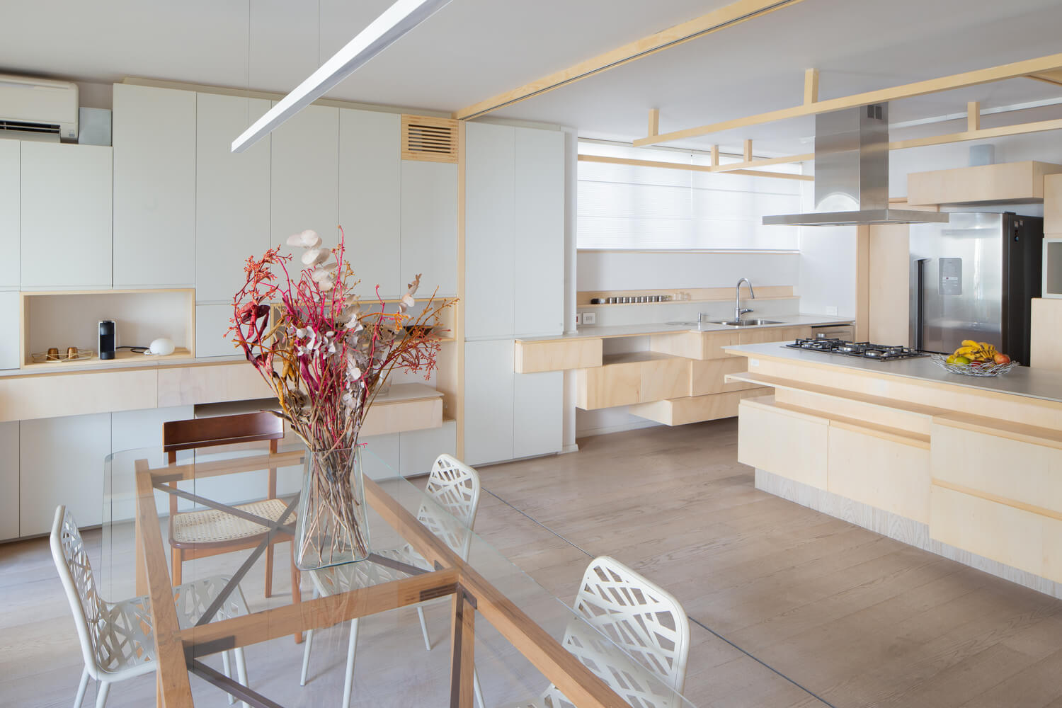 주택의 전체 목공 디자인 외에도 사무실에서는 소파, 식탁 등 방에 있는 일부 가구도 디자인했습니다. 소파는 환경의 통합과 연결의 중심이 되도록 디자인했다고 할 수 있습니다. 그것은 다양한 기능을 가지고 있으며 휴식의 순간과 대화 및 사교의 순간 모두에 사용될 수 있습니다. 반면에 테이블은 일본 가구 제조에서 영감을 받아 피팅으로 만든 마운팅을 갖춘 가구 제조 구조를 가지고 있습니다. 심플하고 가벼운 디자인으로 다양한 환경에 적합합니다.